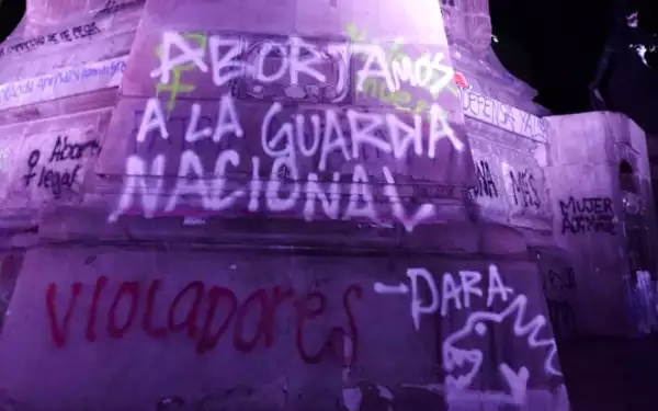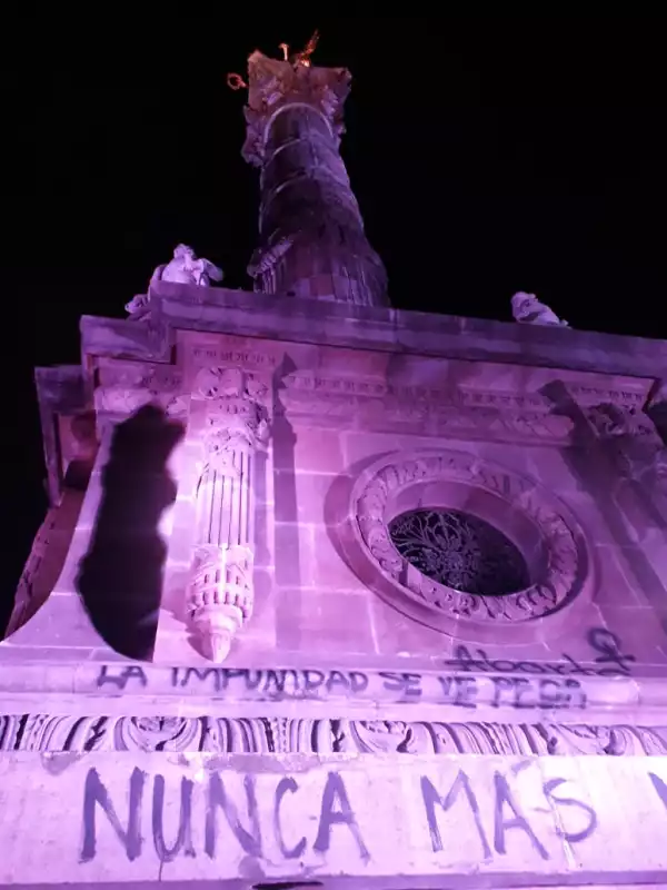 Además de incendiar una estación de policía y de dañar parte de las instalaciones del Metrobús, en la Glorieta del Metro Insurgentes, grupos que participaron en la marcha también dejaron pintas en las columnas que rodean el Ángel y en el basamento de la columna principal.