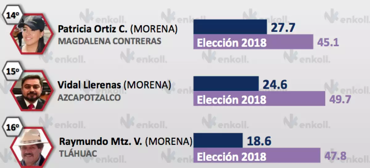 Además de estos tres alcaldes de oposición en el Top Cinco de alcaldes con más posibilidades de ser reelectos, se cuelan los morenistas Clara Brugada, de Iztapalapa y Nestor Núñez, de la Cuauhtémoc.
