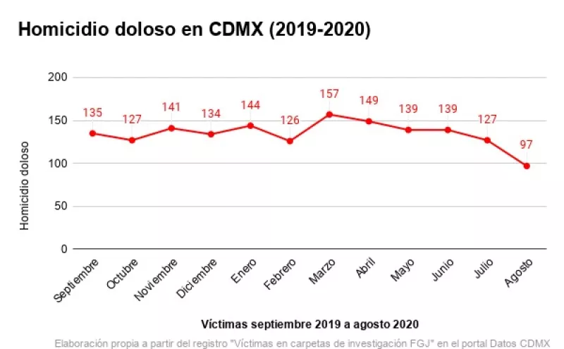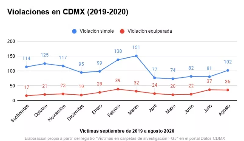 Las víctimas de violación simple se incrementaron al inicio de la pandemia al pasar de 99 en enero a 138 en febrero y 151 en marzo, para disminuir a 77 en abril y en el último mes de agosto repuntar de nuevo a 102. Entre septiembre de 2019 y agosto de 2020 se registraron 2,060 víctimas de violación de las cuales el 90.6% son mujeres y 9.4% hombres.