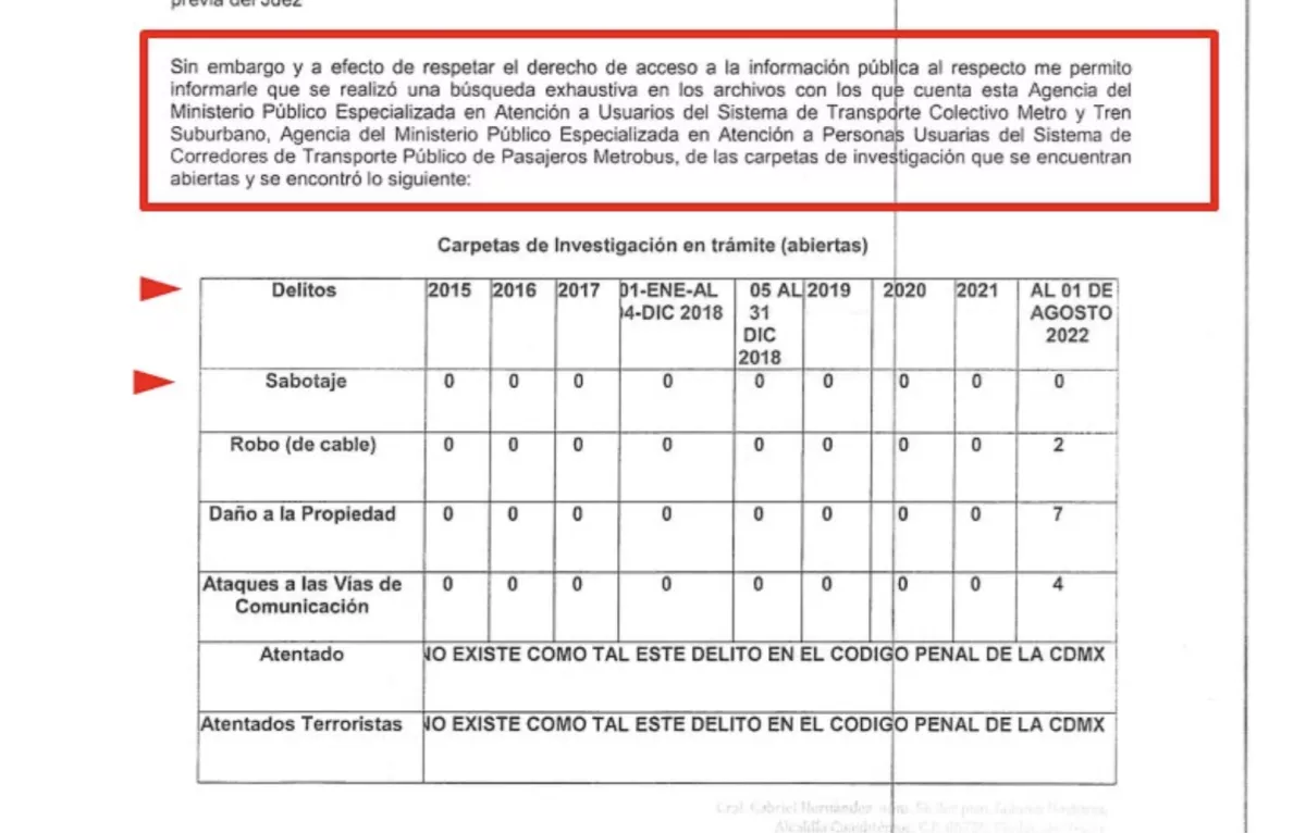 El choque en la estación Tacubaya de la línea 1 del Metro, ocurrida en 2020, el incendio de la subestación eléctrica de “Buen Tono” en enero de 2021, la caída del tramo elevado en la línea 12 del metro en mayo de 2021, así como diversos cortocircuitos y otros incidentes registrados Metro durante la actual administración, fueron causal para consultar a las autoridades si existían indagatorias sobre posible sabotaje.