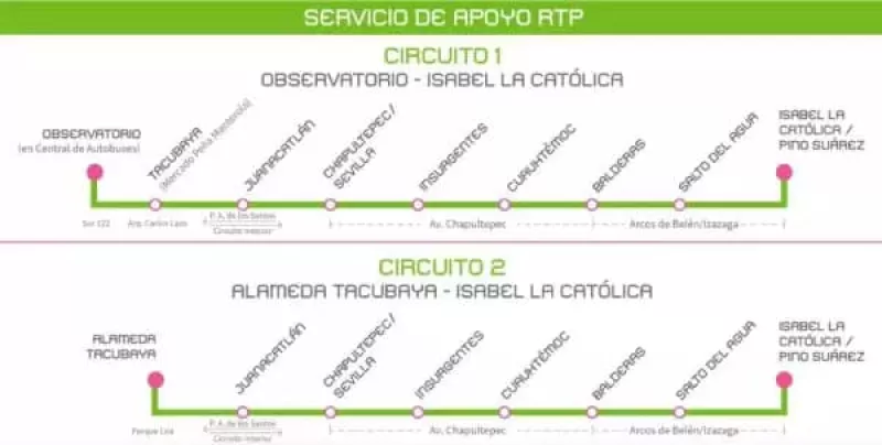 Consulta el mapa con los puntos de ascenso y descenso del servicio de apoyo de RTP por el cierre del segundo tramo de la Línea 1 del Metro, que opera de Isabel la Católica/Pino Suárez-Observatorio.