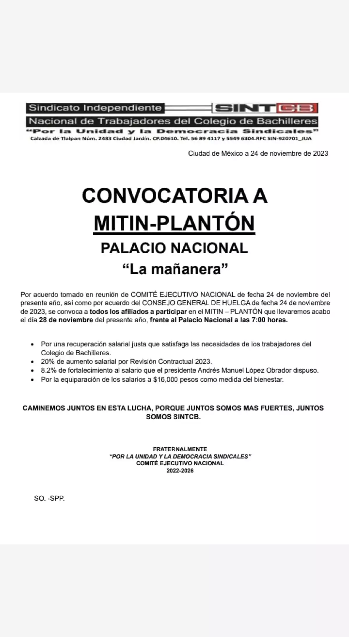 El sindicato llamó a todos sus afiliados a participar en un un mitin-plantón, el 28 de noviembre a las 7:00 am, frente al Palacio Nacional. Los agremiados buscan que el mitin suceda mientras, al interior del recinto, se lleva a cabo la conferencia 'Mañanera' del presidente Andrés Manuel López Obrador.