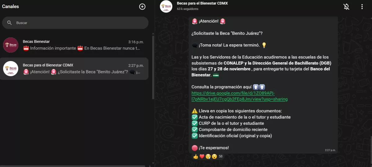 Después de elegir el canal del estado correspondiente, este se agregará en la sección de “Canales” de tu WhatsApp, la cual informará de las próximas fechas de entrega de tarjetas, así como otros anuncios oficiales sobre los pagos.