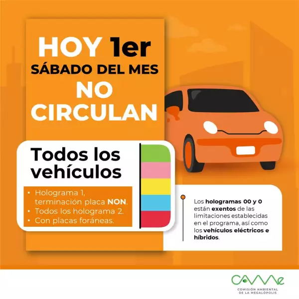 Por ser el primer sábado del mes, la restricción del Hoy No Circula aplicará de la siguiente manera: