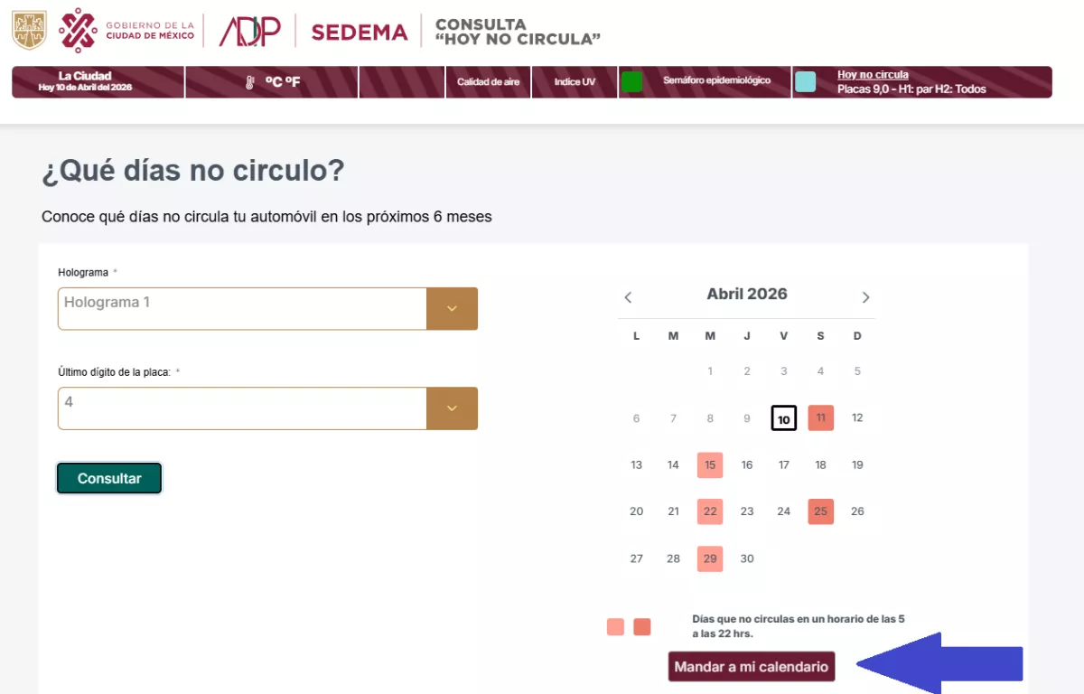 Antes de salir, revisa tu holograma y el número final de tu placa para cumplir con el Hoy No Circula Sabatino. Puedes revisar cuándo no puedes circular a través del calendario de la Sedema, disponible aquí: https://hoynocircula.cdmx.gob.mx/
