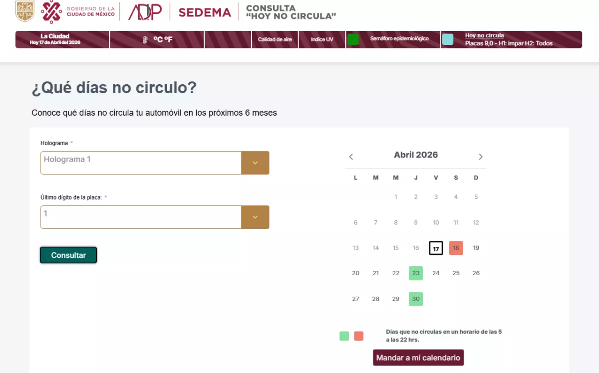 Antes de salir, revisa tu holograma y el número final de tu placa para cumplir con el Hoy No Circula Sabatino. Puedes revisar cuándo no puedes circular a través del calendario de la Sedema, disponible aquí: https://hoynocircula.cdmx.gob.mx/