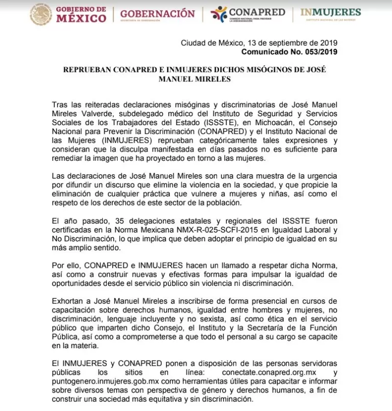 Martha Lucía Mícher, de Morena, acompañó la propuesta y dijo que en la Comisión para la Igualdad de Género, que ella preside, se acordó no repetir una misiva como la que se concretó este miércoles en la Cámara de Diputados, pero sí solicitar el despido de Mireles a través de un exhorto al ISSSTE.