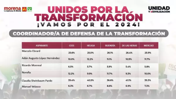 El dirigente nacional de Morena, Mario Delgado, y el presidente de la Comisión Nacional, Alfonso Durazo, informaron los resultados de las cinco encuestas que se levantaron la Comisión Nacional de Elecciones y cuatro empresas encuestadoras y que le dieron el triunfo a la exjefa de Gobierno de la Ciudad de México por casi 15 puntos de ventaja sobre el excanciller, Marcelo Ebrard, su más cercano contendiente .