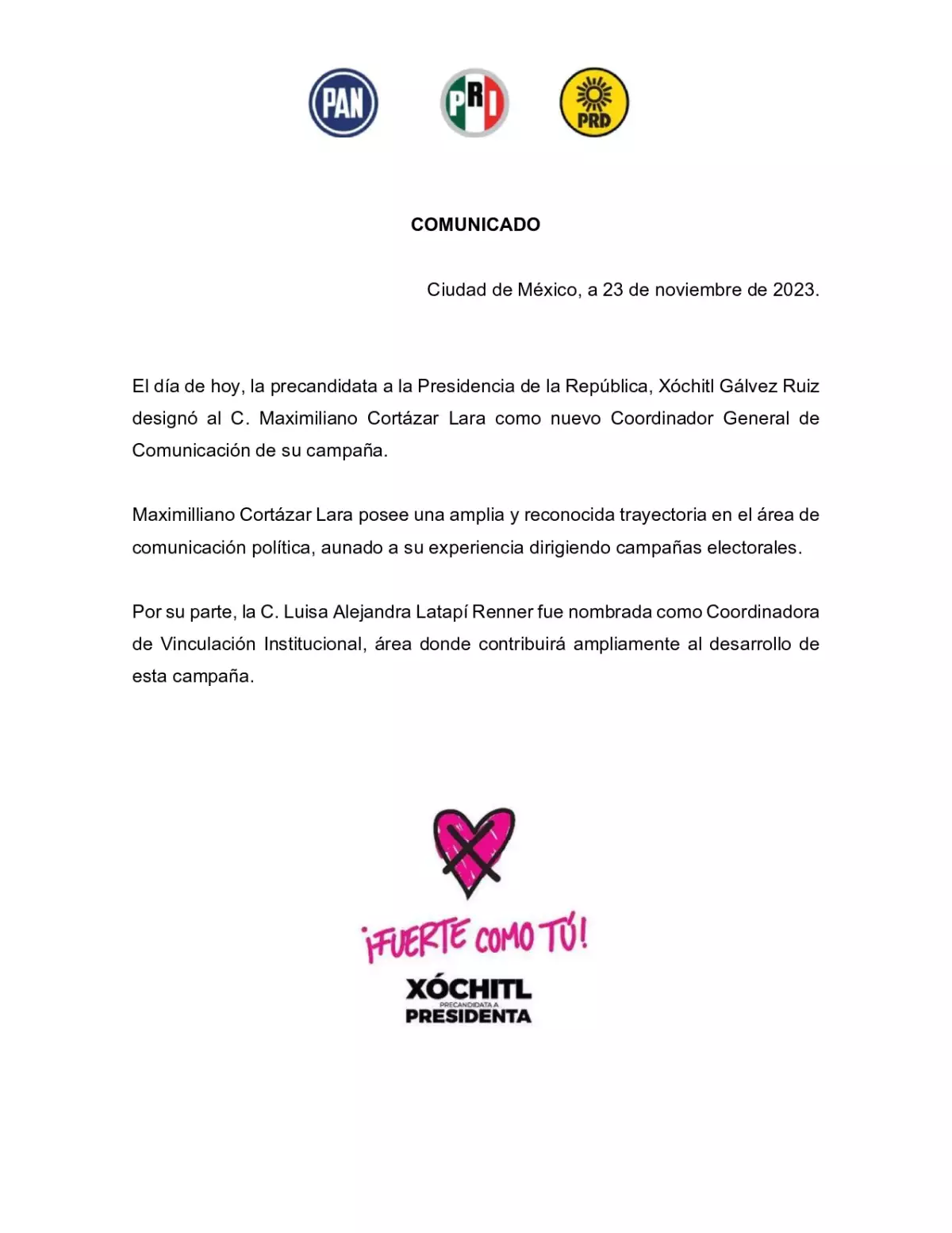 Esya tarde se dio a conocer que Xóchitl Gálvez designó a Max Cortázar, antiguo colaborador de Felipe Calderón, como su nuevo vocero de campaña.