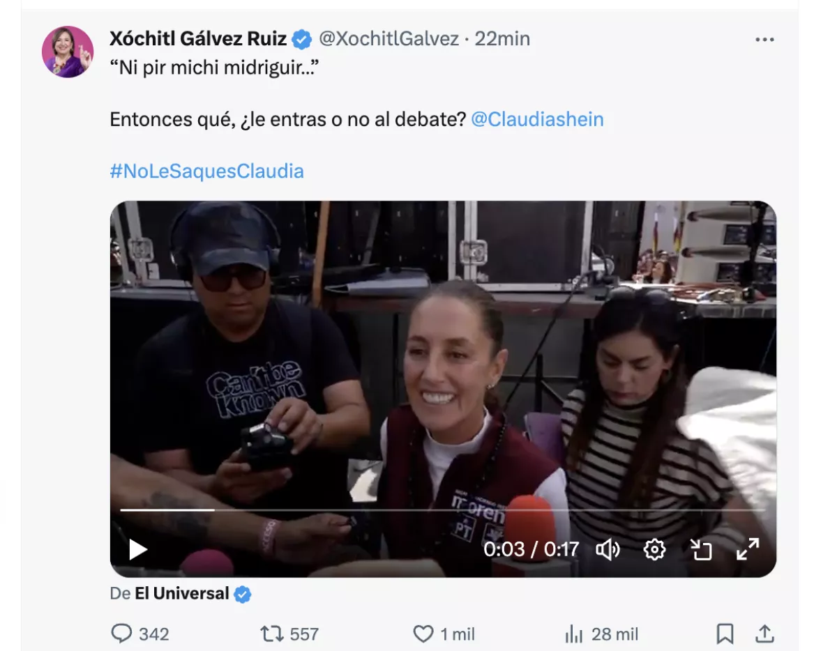 "Ni pir michi midriguir… Entonces qué, ¿le entras o no al debate? @Claudiashein#NoLeSaquesClaudia".