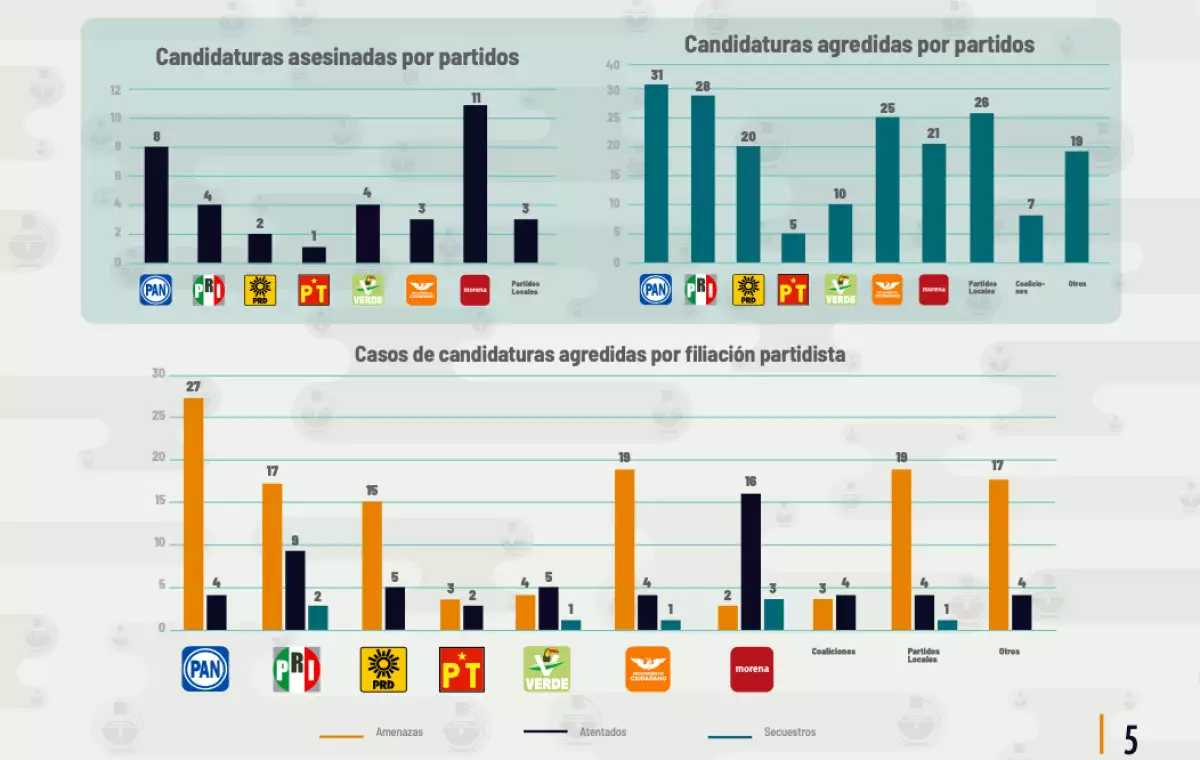 El reporte indica que Morena es el partido con mayor cantidad de aspirantes asesinados (11), seguido del PAN (8), PRI (4).
