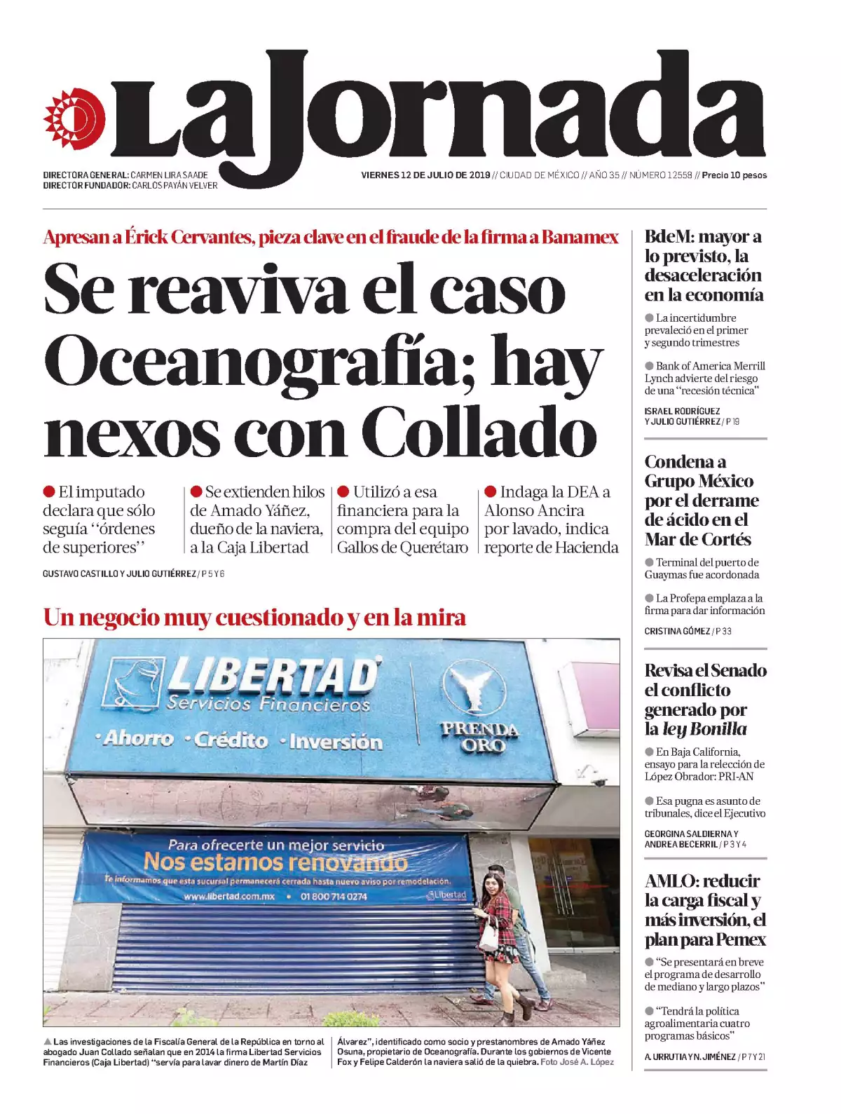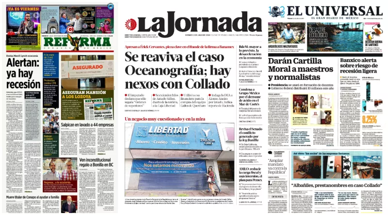 Las autoridades dieron a conocer que fue detenido Erick Cervantes Murillo, identificado como uno de los principales involucrados en el fraude por más de 5 mil millones de pesos cometido en 2014 contra Banamex por Amado Yáñez Osuna, dueño de la empresa Oceanografía, destaca La Jornada. Cervantes Murillo, quien trabajaba como ejecutivo de la institución financiera, dijo al comparecer ante la autoridad que “sólo recibía órdenes de sus superiores y nada más”, sin abundar en detalles de quiénes beneficiaron a Yáñez Osuna.