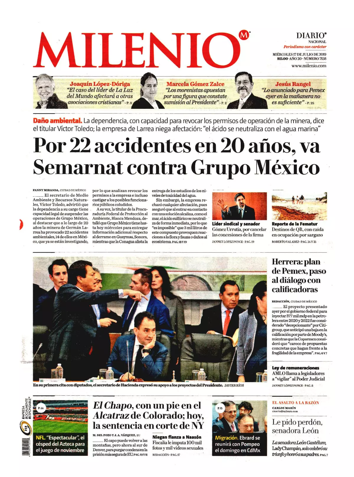 La Secretaría de Medio Ambiente y Recursos Naturales (Semarnat) tiene la capacidad legal de suspender las operaciones de Grupo México, advirtió el titular de la dependencia, Víctor Toledo, al destacar que a lo largo de 20 años la minera de Germán Larrea ha provocado 22 accidentes ambientales —14 de ellos en México—, que ya se investigan, por lo que pueden revocar los permisos a la empresa y castigar a funcionarios públicos coludidos, publica Milenio. “Desde 1998 han estado provocando accidentes no solamente en el país sino también en Perú, Estados Unidos y España”, señaló.