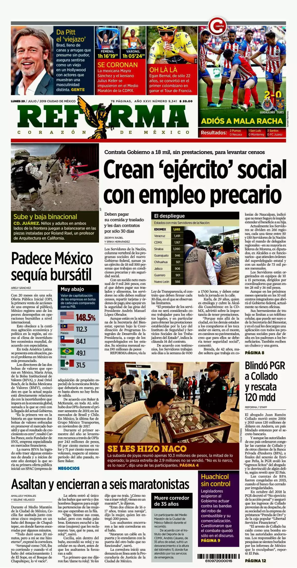 Los Servidores de la Nación, columna vertebral de los programas sociales del nuevo Gobierno federal, suman ya un ejército de 18 mil 500 personas que trabajan en condiciones precarias y sin seguridad social, publica Reforma. Con un sueldo neto mensual de nueve mil 266 pesos, con el que deben pagar sus traslados y alimentos, los servidores no solo deben realizar censos, repartir tarjetas y órdenes de pago, sino apoyar en la seguridad de las giras del presidente Andrés Manuel López Obrador.