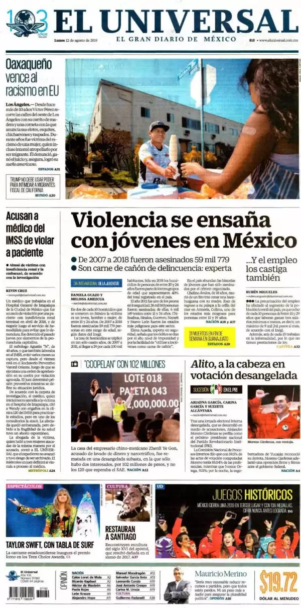 En dos de cada 10 homicidios que se cometen en México la víctima es un joven, hombre o mujer, de entre 15 y 24 años, publica El Universal. De 2007 a 2018 fueron asesinadas 59 mil 779 personas en este rango de edad, según datos del INEGI. La tasa de homicidios se triplicó en tan sólo cuatro años, de 2007 a 2011, al llegar a 29 por cada 100 mil habitantes. Sólo en 2018 los homicidios de personas de entre 20 y 24 años fueron parte de los tres grupos de edad que representaron 40% del total registrado en el país.