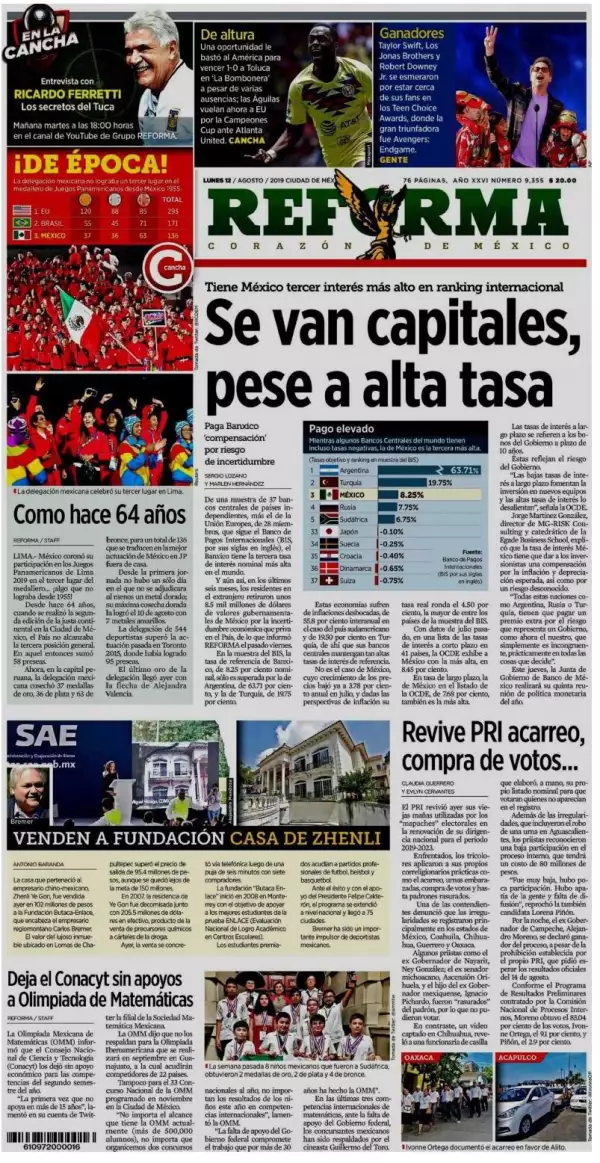 De una muestra de 37 bancos centrales de países independientes, más el de la Unión Europea, de 28 miembros, que sigue el Banco de Pagos Internacionales (BIS, por sus siglas en inglés), el Banxico tiene la tercera tasa de interés nominal más alta en el mundo. Y aún así, refiere Reforma , en los últimos seis meses, los residentes en el extranjero retiraron unos 8.5 mil millones de dólares de valores gubernamentales de México por la incertidumbre económica que priva en el país.