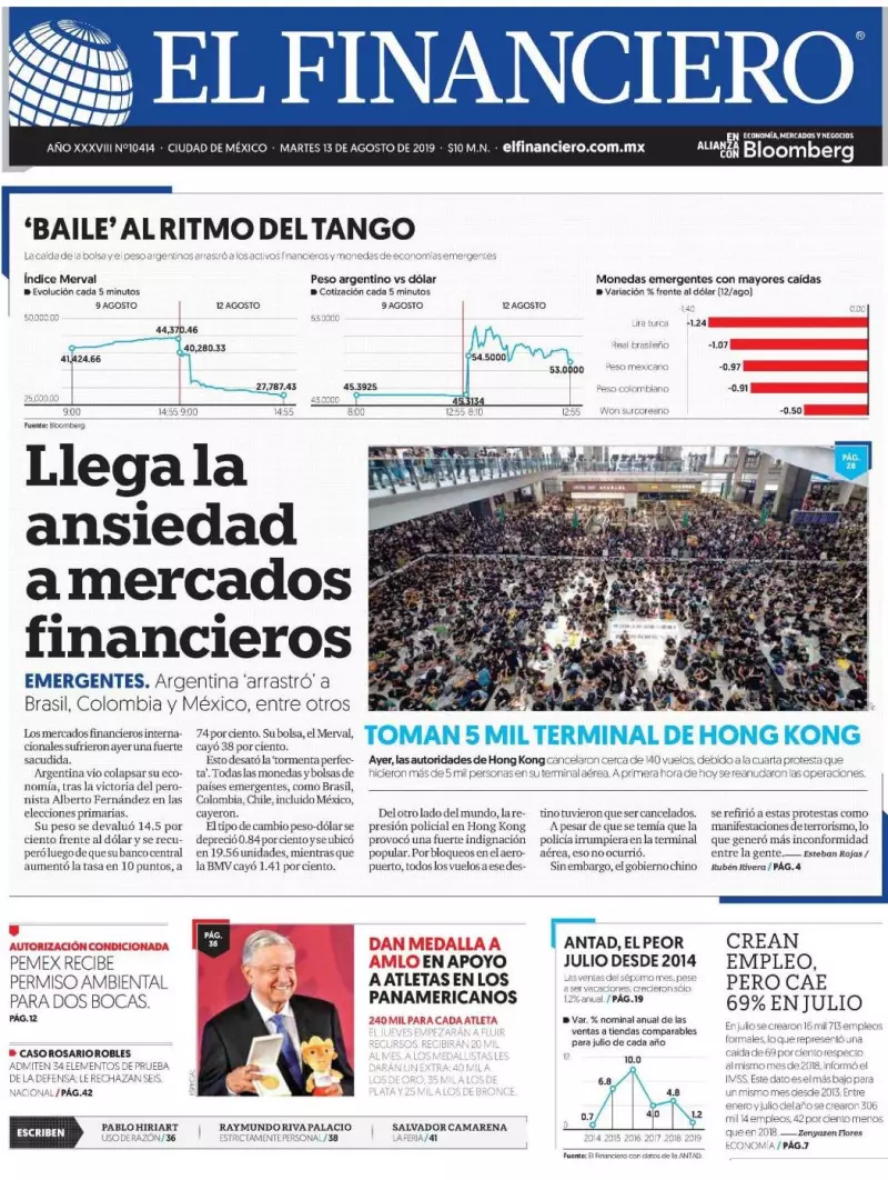 Los mercados financieros internacionales registraron este lunes una fuerte sacudida por el ‘efecto tango’, que hundió al mercado accionario y al peso en Argentina, luego de que el presidente de ese país, Mauricio Macri, perdió inesperadamente las elecciones primarias, frente a la oposición representada por Alberto Fernández, presagiando una derrota en las elecciones presidenciales de octubre y un posible retorno a las políticas de su predecesora, Cristina Kirchner, destaca El Financiero. El índice Merval, de la Bolsa de Argentina, se desplomó ayer 37.9%, mientras que el tipo de cambio en ese país se derrumbó un 17%, aunque llegó a perder 37%.