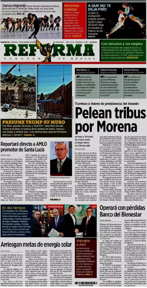 Las tribus internas de Morena luchan por las posiciones de poder al amparo del partido que fundó el presidente Andrés Manuel López Obrador hace cinco años, reseña Reforma. Este lunes, los senadores de Morena y del PES rechazaron la reelección de Martí Batres como presidente de la Cámara alta, en una consulta a voto de urna que, a decir del legislador, resultó desaseada por el coordinador parlamentario Ricardo Monreal.