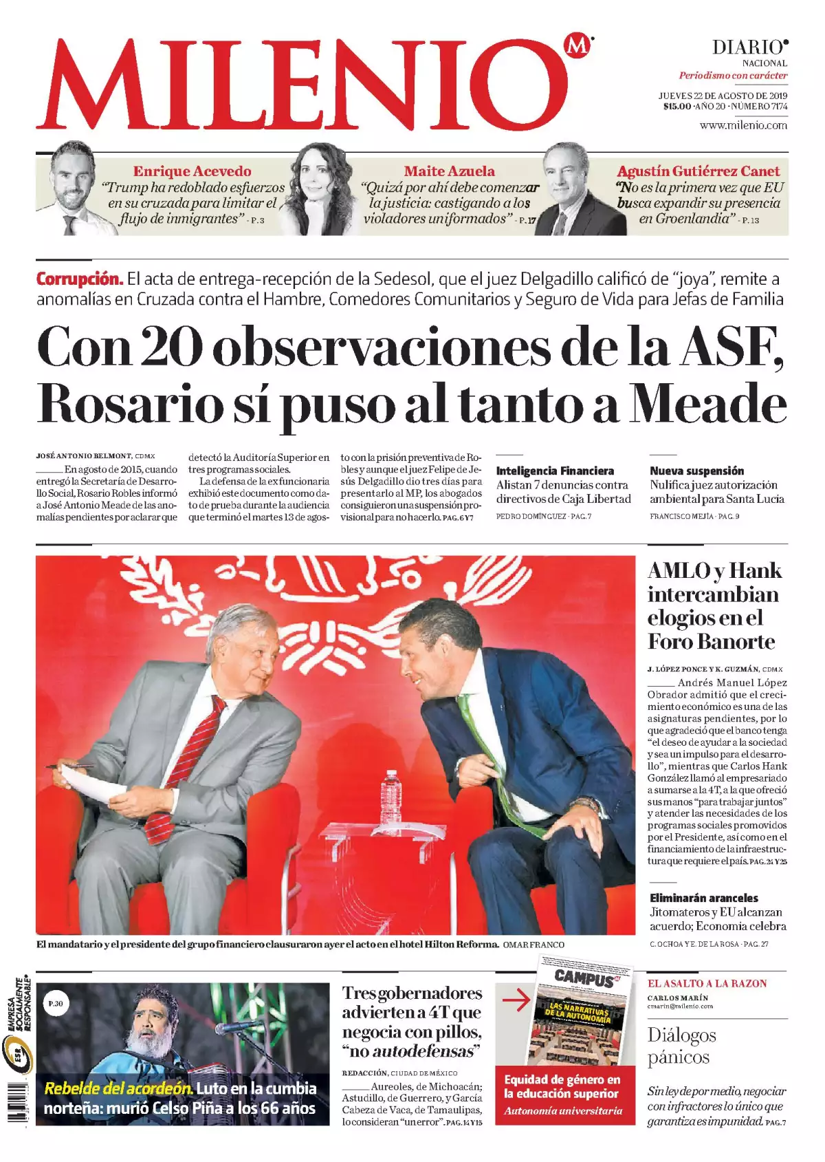 En agosto de 2015, cuando entregó la Secretaría de Desarrollo Social, Rosario Robles informó a José Antonio Meade de 20 observaciones pendientes por solventar sobre posibles irregularidades que detectó la Auditoría Superior de la Federación (ASF) en tres programas sociales, publica Milenio. En la acta de entrega-recepción de la ex secretaria de Estado, la que el juez Felipe de Jesús Delgadillo Padierna calificó de “joya”, consta la notificación en el décimo numeral romano denominado “Observaciones de auditorías”.