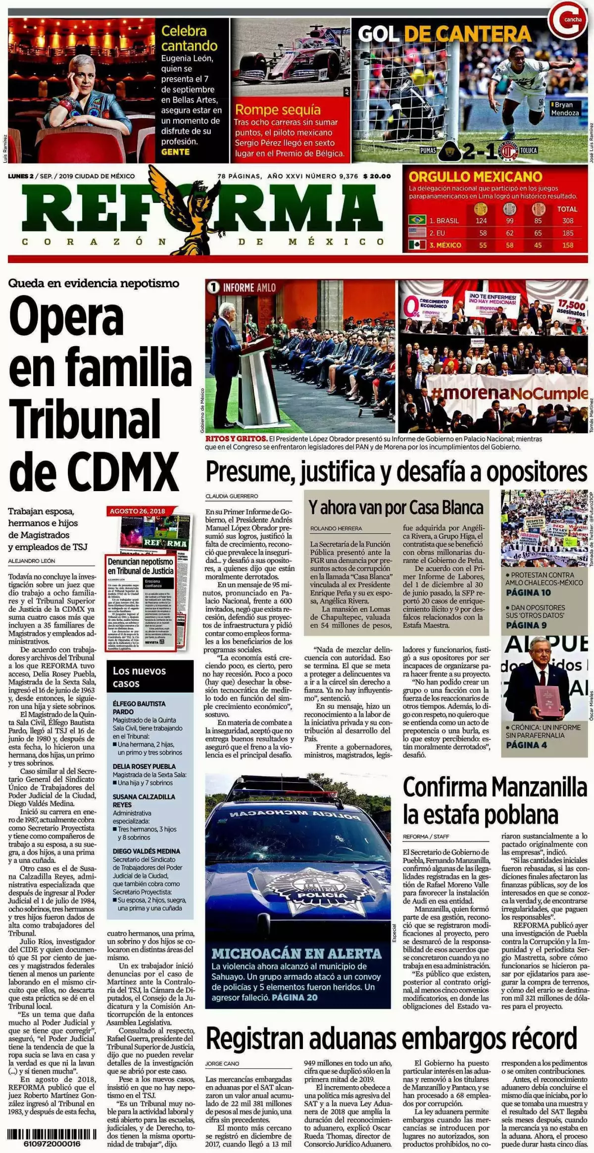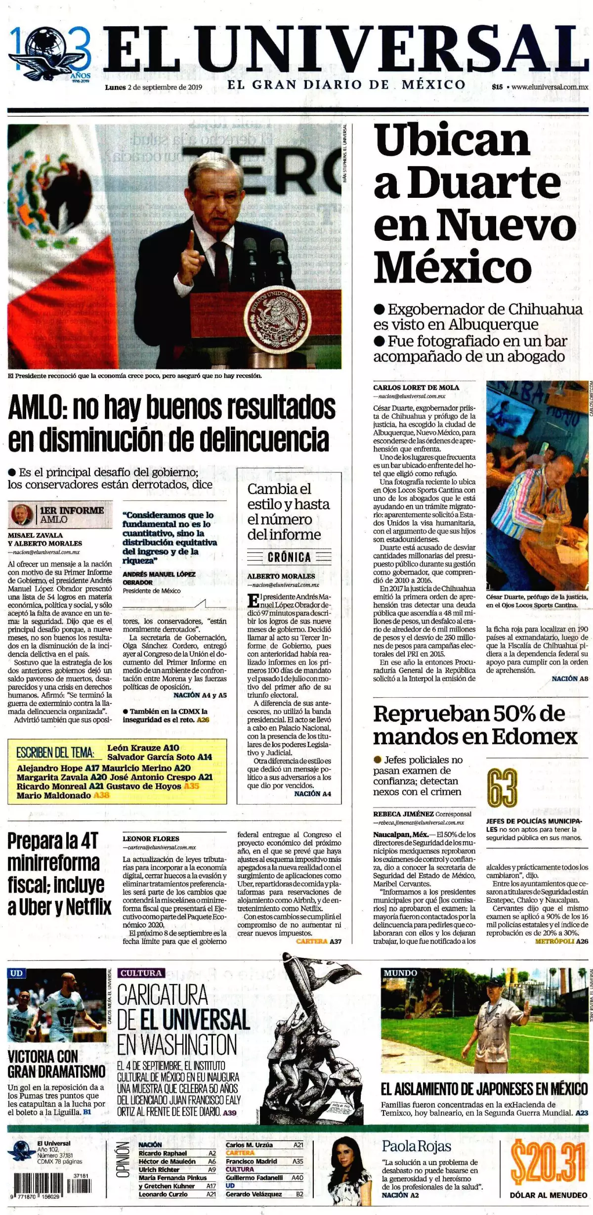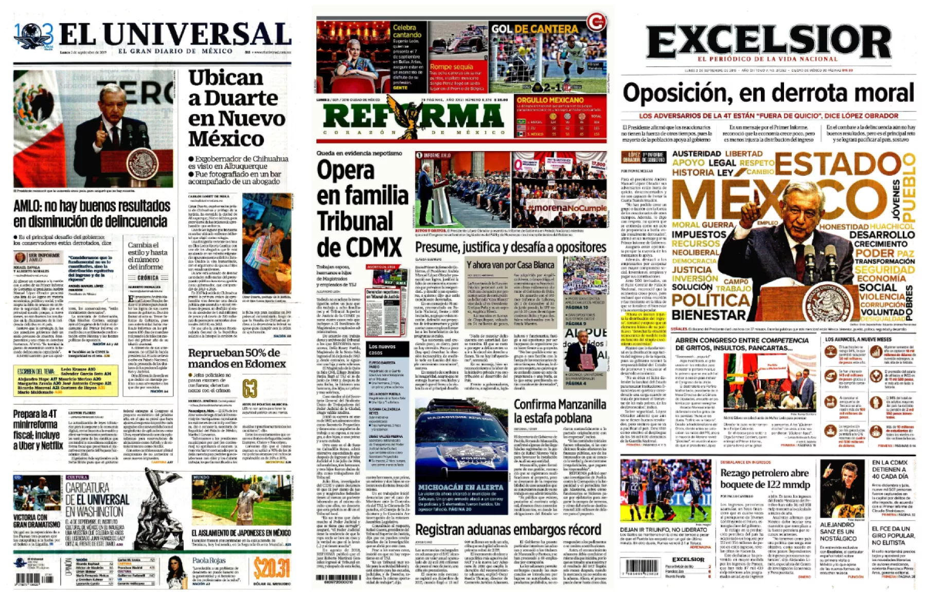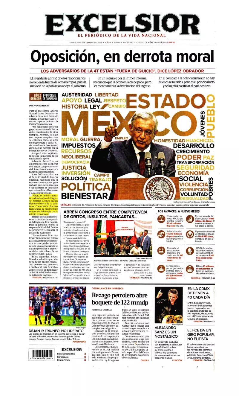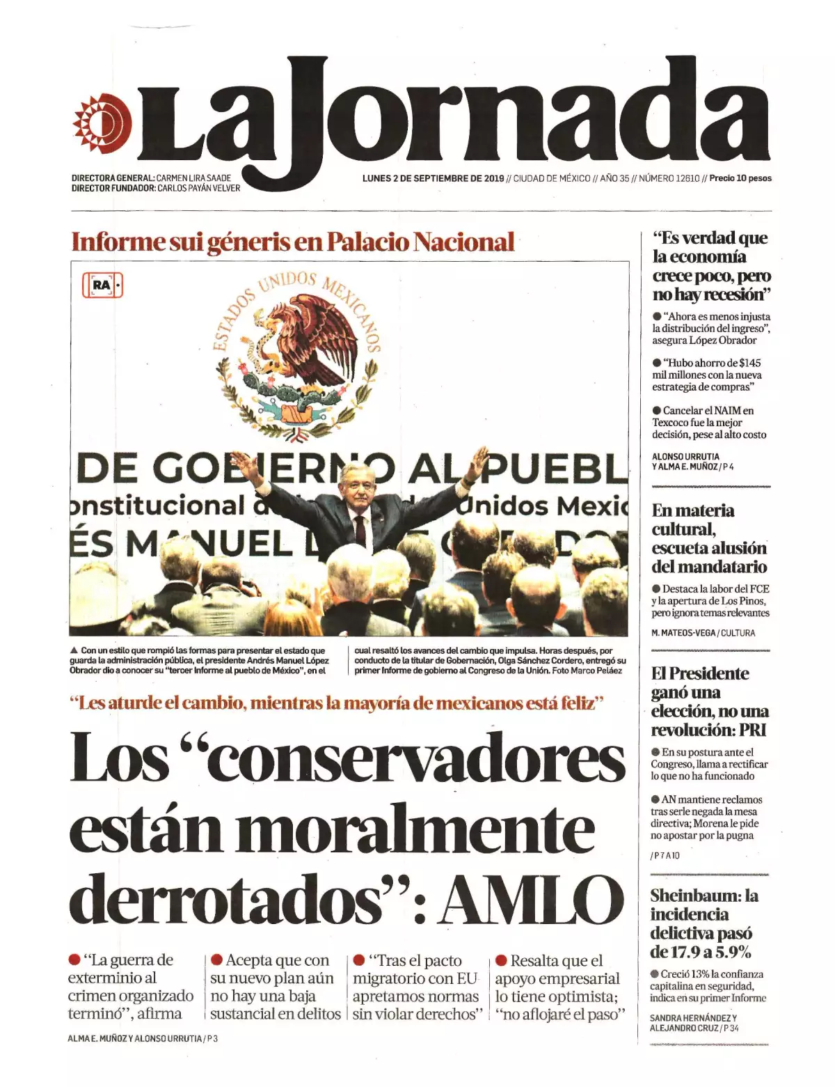 En tanto, La Jornada reseña: La guerra de exterminio contra el crimen organizado terminó: no habrá más razias, masacres ni desaparición de personas, afirmó el presidente Andrés Manuel López Obrador, quien reconoció, en paralelo, que con la nueva estrategia aún “no son buenos los resultados en cuanto a la disminución de la incidencia delictiva”. Día oficialmente destinado a la presentación del Informe de gobierno en el que proclamó: “los conservadores están moralmente derrotados”.
