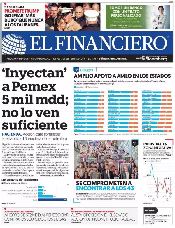 Los 5 mil millones de dólares que el gobierno inyectará a Pemex le dan margen de maniobra y mejoran su perfil crediticio, pero son insuficientes, dados los fuertes requerimientos financieros de la petrolera y la elevada carga fiscal, consideraron agencias calificadoras. El Financiero indica que Fitch y Moody's consideraron que pese a los recursos que recibirá la petrolera del Gobierno, la perspectiva de calificación de la empresa sigue siendo negativa y el problema fundamental está en su modelo de exploración y producción.