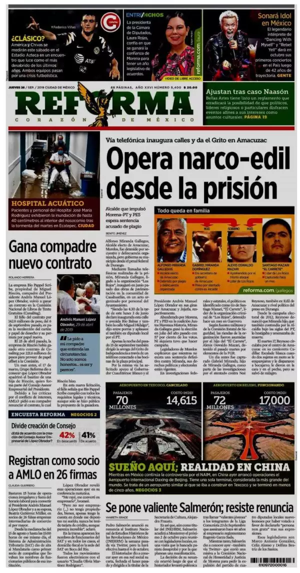 Alfonso Miranda Gallegos, alcalde electo de Amacuzac, Morelos, fue detenido por secuestro y delincuencia organizada, pero gobierna su municipio desde el penal federal de Durango, destaca Reforma. Mediante llamadas telefónicas realizadas desde la prisión, Miranda Gallegos, ligado a la organización "Los Rojos", inauguró en junio pasado dos obras de pavimentación en la comunidad de Casahuatlán, en un acto organizado por personal del Ayuntamiento.