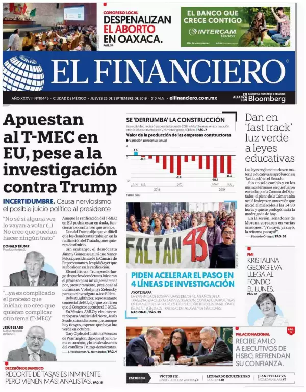 Sector privado y gobiernos coincidieron en que si bien la posibilidad de un juicio político al Presidente de Estados Unidos, Donald Trump pudiera retrasar la aprobación del Tratado entre México, EU y Canada (T-MEC), éste verá la luz, refiere El Financiero. Richard Neal, congresista de EU que lidera las negociaciones, declaró que no permitirá que el impeachment afecte su trabajo alcanzado en para ratificar el acuerdo comercial.