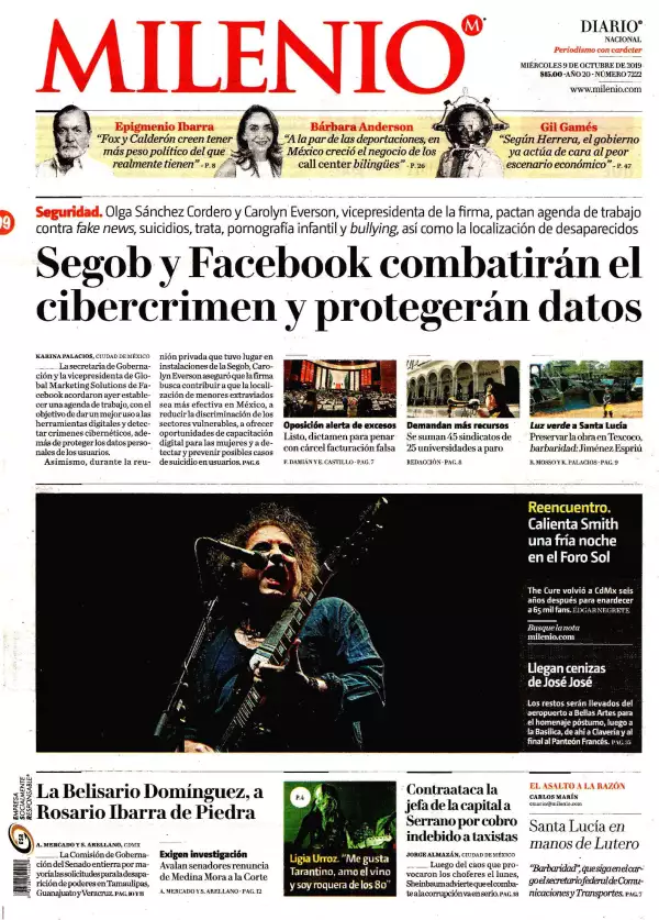 La secretaria de Gobernación, Olga Sánchez Cordero, y la vicepresidenta de Global Marketing Solutions de Facebook, Carolyn Everson, acordaron establecer una agenda de trabajo con el objetivo de dar un mejor uso a las herramientas digitales y detectar crímenes cibernéticos, prevenir suicidios y proteger los datos personales de los usuarios, reporta Milenio. Señalaron que entre los temas que se deben analizar se encuentran los relacionados a la violencia contra las mujeres y los niños, la privacidad de datos personales, las fake news, la delincuencia cibernética, la prevención de suicidio, la trata de personas, la pornografía infantil y el bullying, así como la localización de personas desaparecidas y el respeto a los migrantes y refugiados.