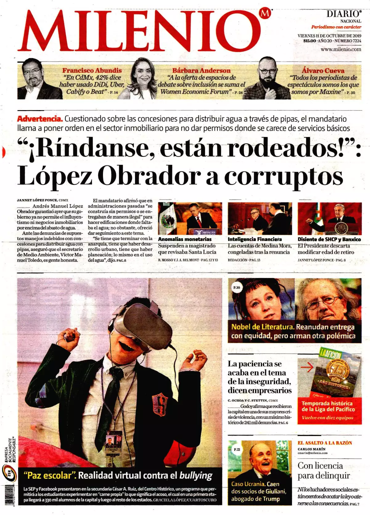 El presidente Andrés Manuel López Obrador garantizó que el gobierno federal ya no permite el influyentismo ni negocios inmobiliarios por encima del abasto de agua, y advirtió a los corruptos: “¡Ríndanse, los tenemos rodeados!”, consigna Milenio. Ante las denuncias de supuestos manejos indebidos con concesiones para distribuir agua con pipas, aseguró que el secretario de Medio Ambiente, Víctor Manuel Toledo, es gente honesta y defensor de la naturaleza.