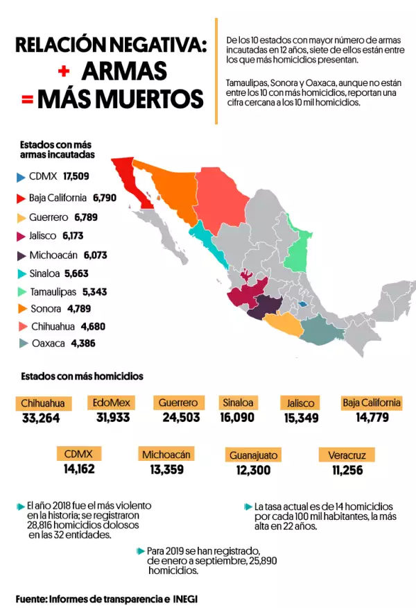 Es un hecho que este tráfico de armas incide directamente en la violencia que se vive el país. En un análisis comparativo, se confirmó que siete de los 10 estados con mayor número de armas incautadas en estos 12 años se enlistan entre los 10 estados con mayor número de homicidios en el país.