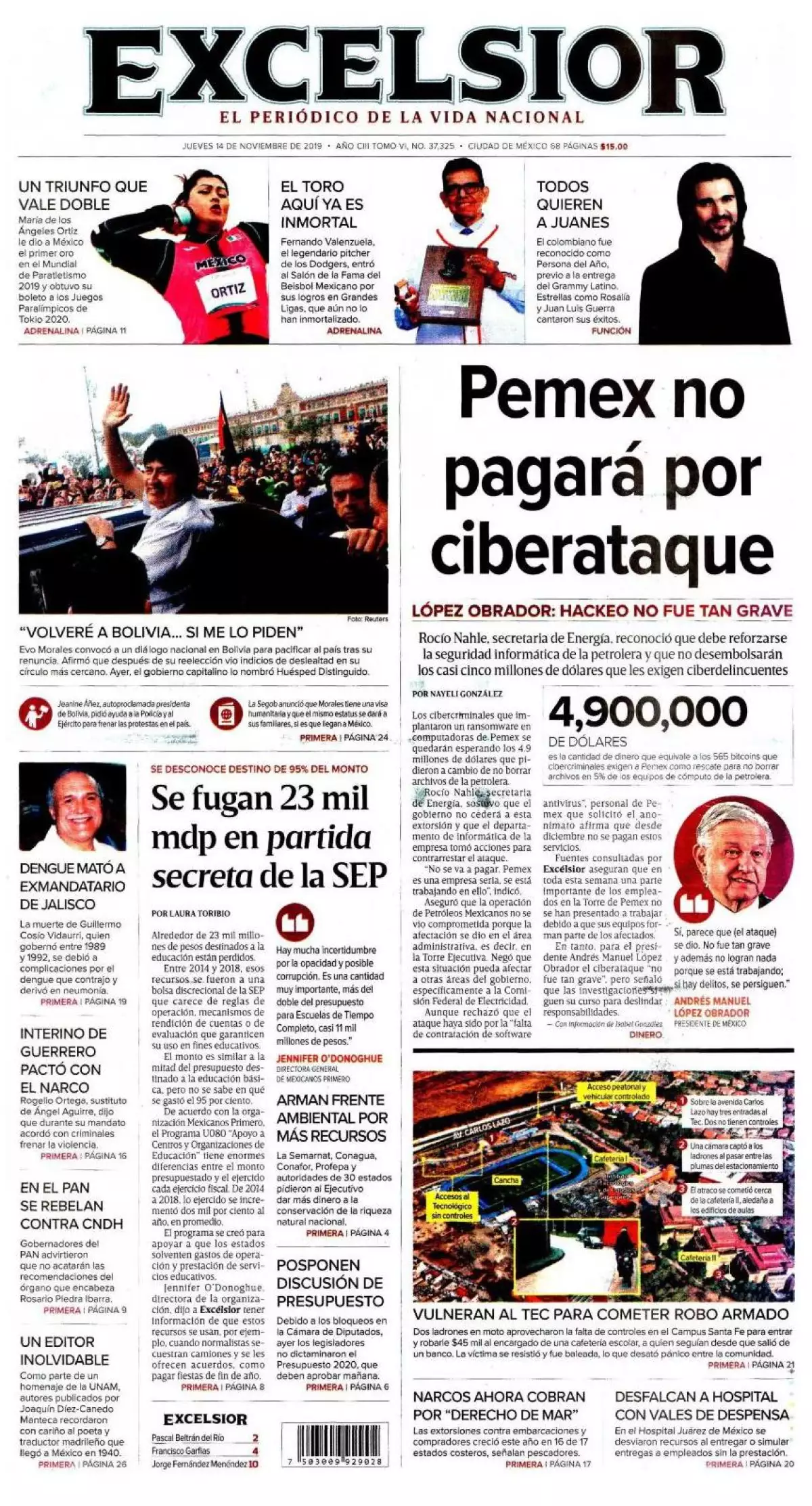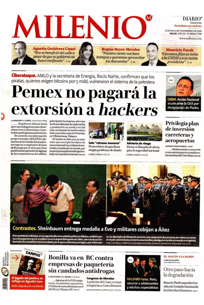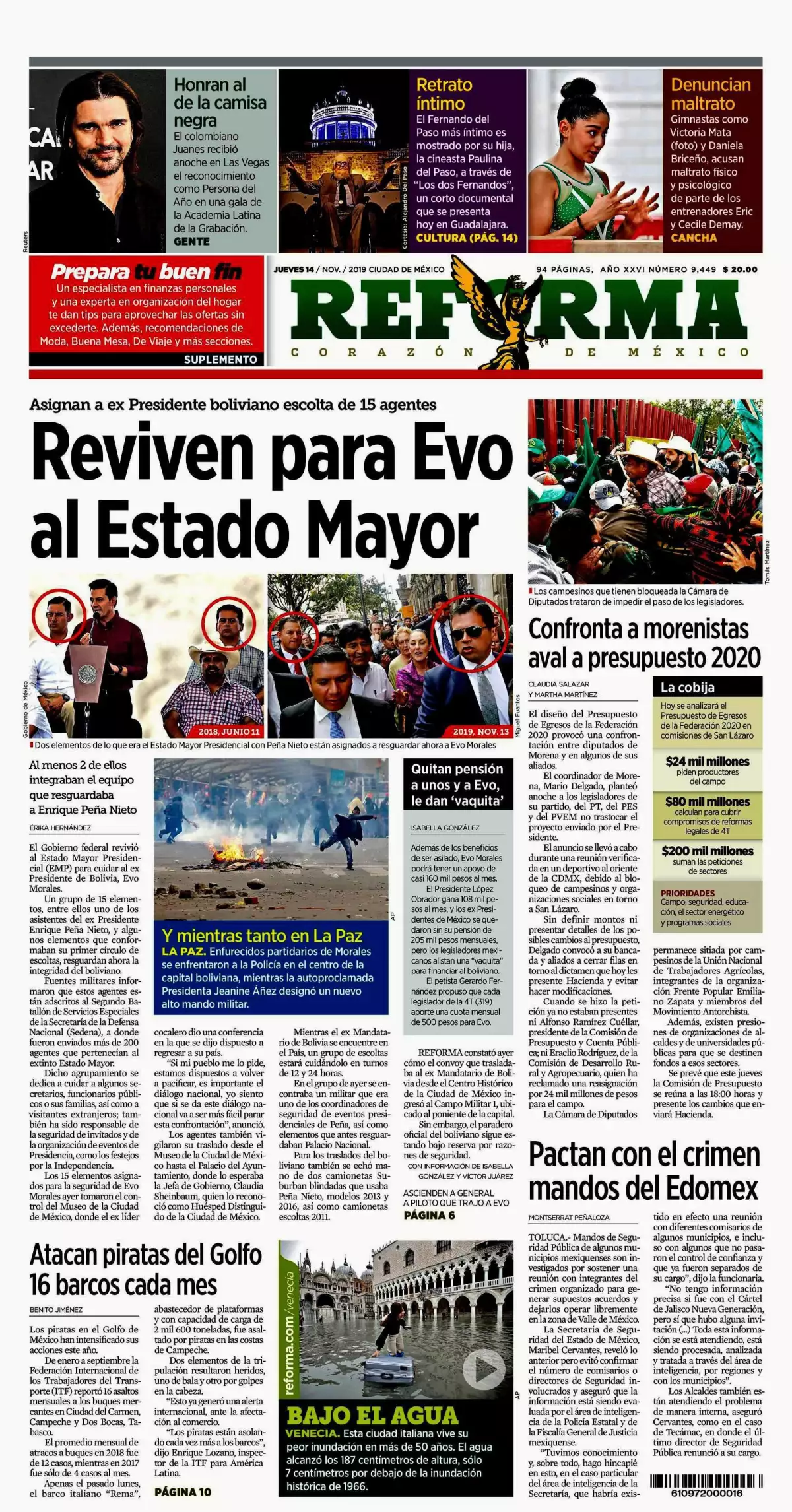 El uso del Estado Mayor Presidencial (EMP) para cuidar al expresidente de Bolivia, Evo Morales, es uno de los temas que figuran en las portadas, además de otros aspectos de las primeras actividades en México del exmandatario.