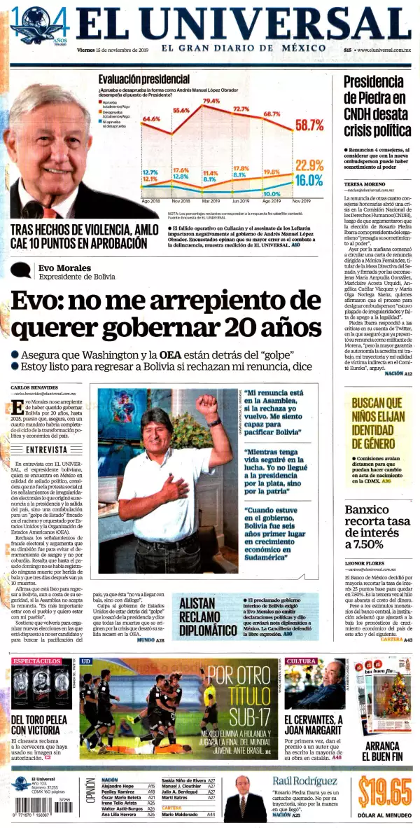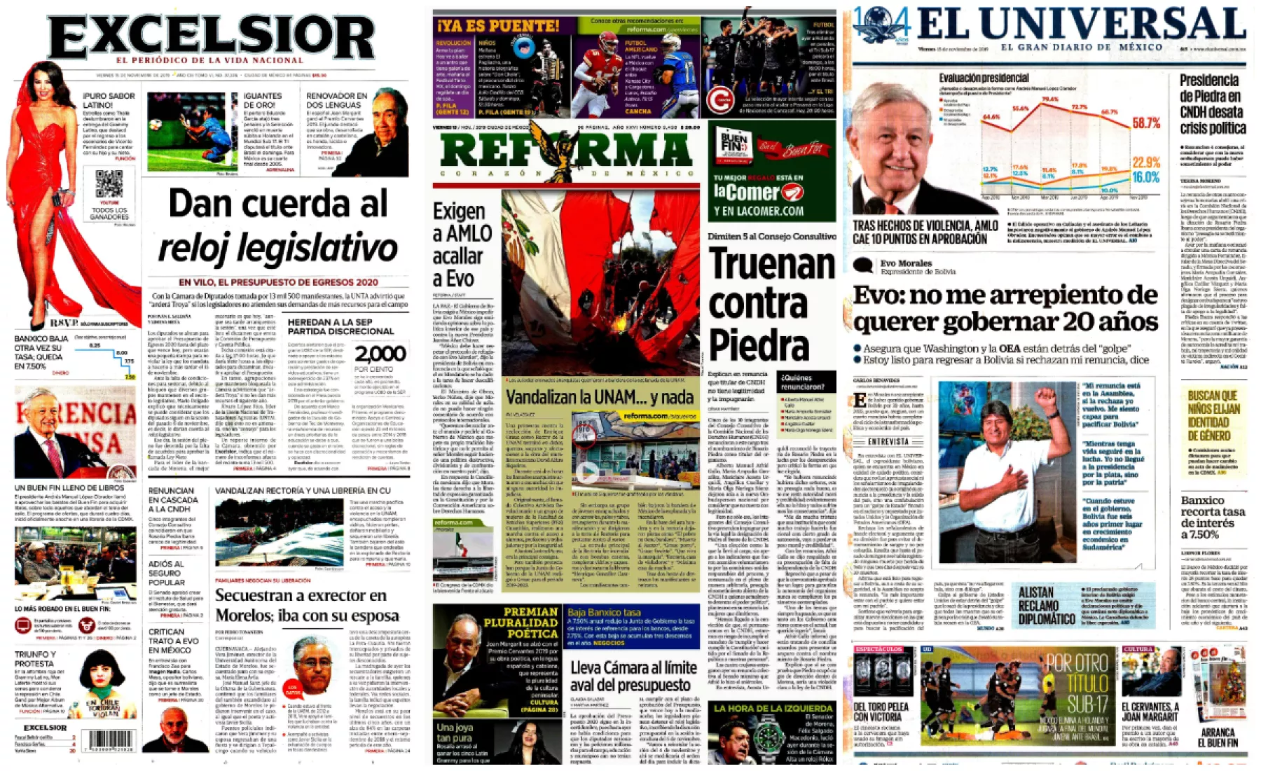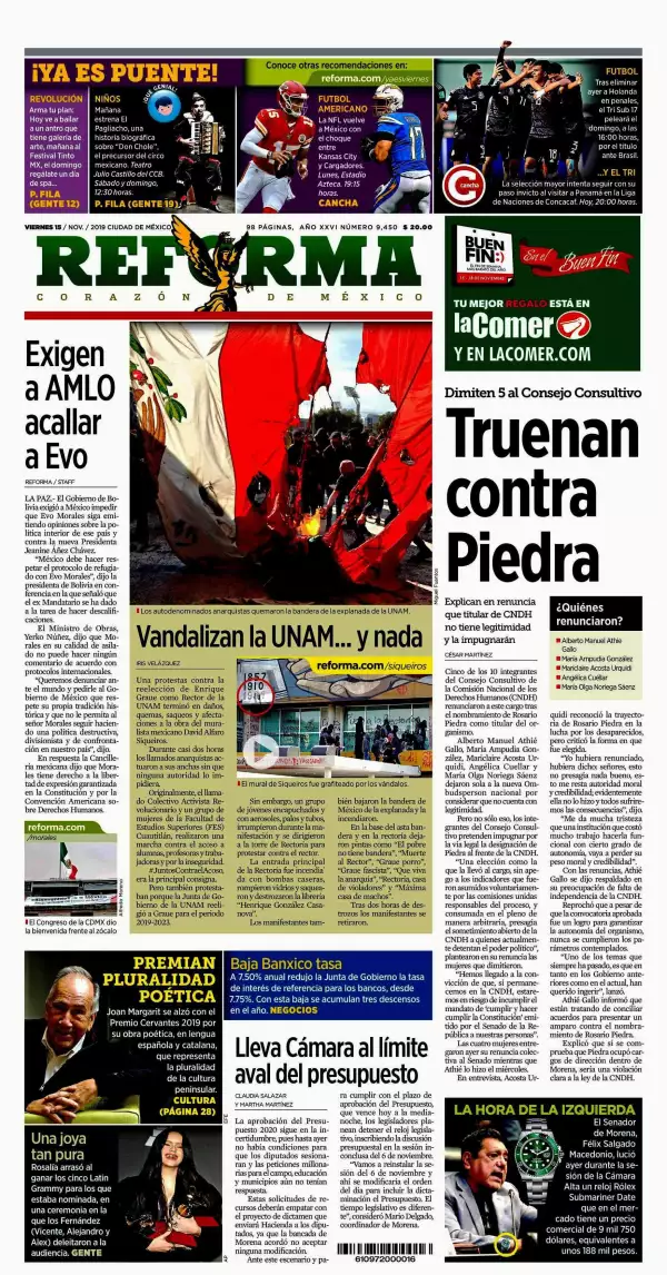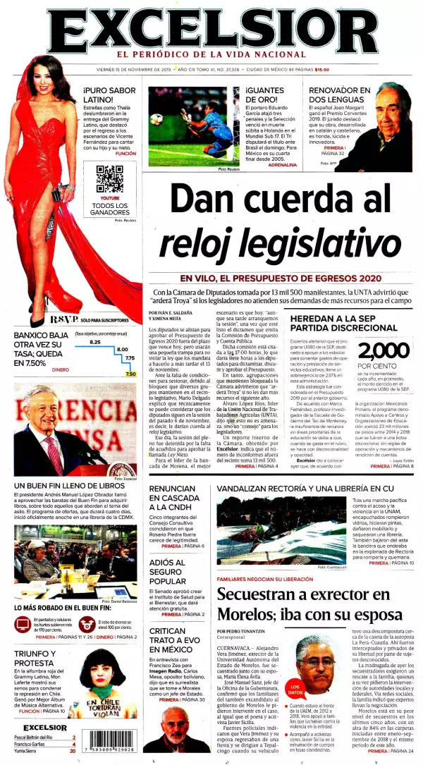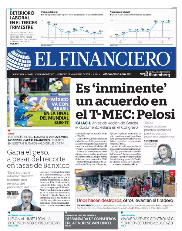 La Jornada destaca que en bloque, las bancadas de Morena, PT, Encuentro Social y su nuevo aliado, el PVEM, votarán sin aceptar ninguna reserva y sin cambios los artículos del proyecto de decreto del Presupuesto de Egresos de la Federación (PEF) 2020. Al cerrarse la negociación con las organizaciones campesinas y de productores agrícolas que exigen, como en tiempos de los gobiernos priistas y panistas, la reasignación de 24 mil millones de pesos para favorecer sus proyectos, también a iniciativa de Mario Delgado se entregó a firmar a diputados de ese bloque una carta de respaldo absoluto al proyecto de gasto del gobierno.