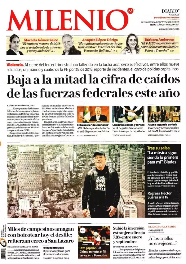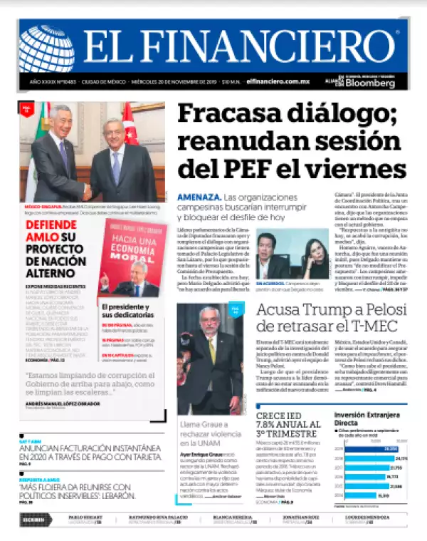 Coordinadores de los grupos parlamentarios acordaron posponer para el próximo viernes, con sede por definir, la sesión ordinaria para la aprobación del Presupuesto de Egresos de la Federación para el 2020, luego que no alcanzaran acuerdo con los líderes de las organizaciones campesinas que mantienen tomada la Cámara de Diputados, destaca El Financiero. “No hay acuerdos todavía para liberar la Cámara de Diputados”, informó el presidente de la Junta de Coordinación Política de la Cámara de Diputados, Mario Delgado, tras un encuentro privado con la agrupación priista Antorcha Campesina.