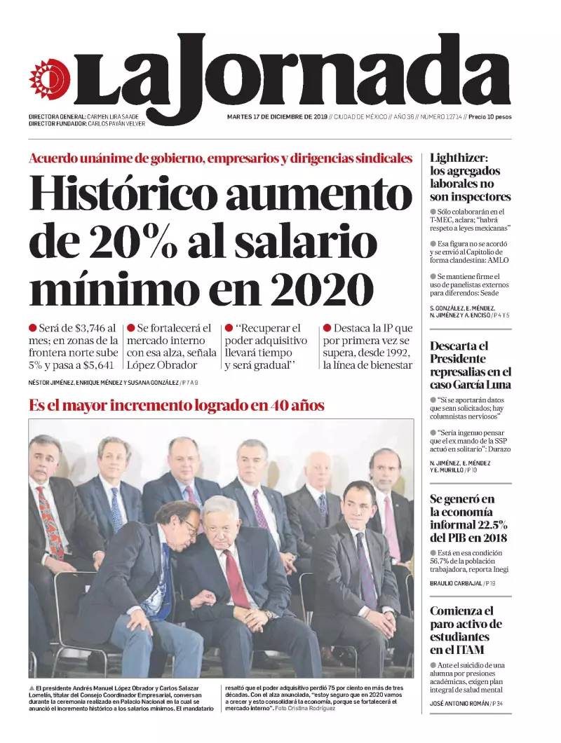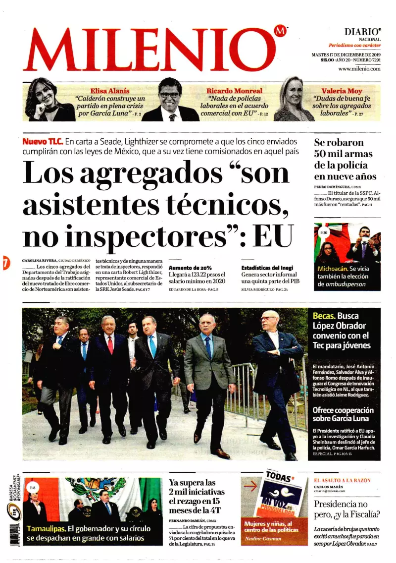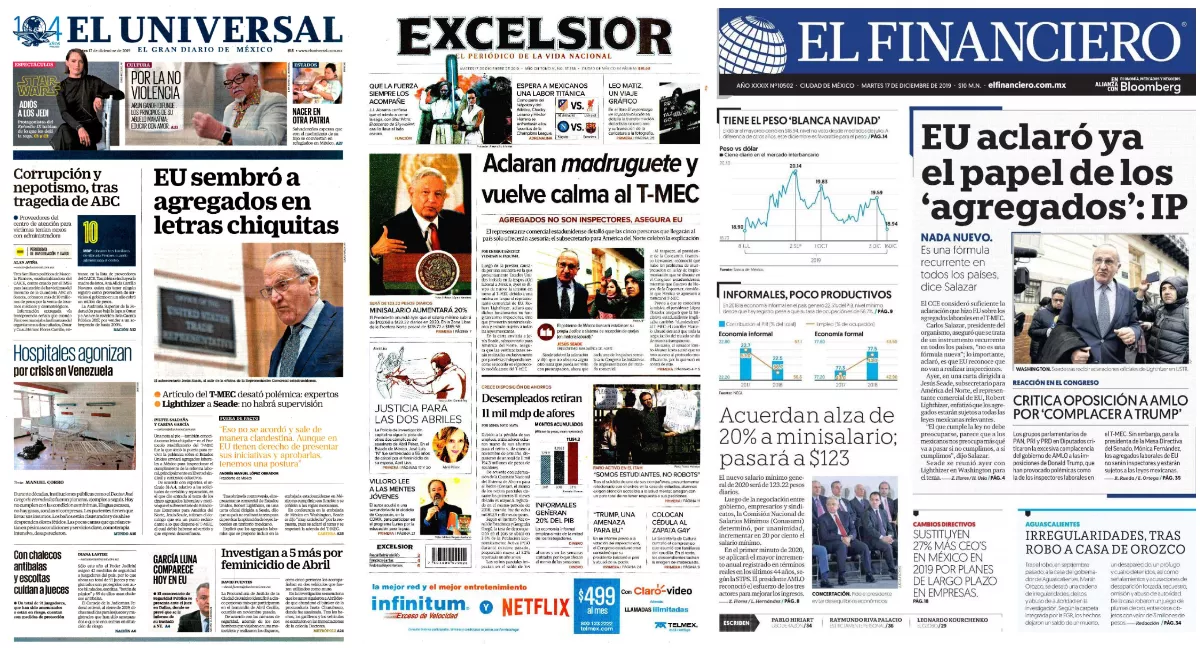 El Financiero señala que la carta que el gobierno de Estados Unidos envió a Jesús Seade, subsecretario para América del Norte, donde aclara que los agregados laborales que considera tener en su Embajada en México, no tendrán función de inspectores, es suficiente, consideró Carlos Salazar Lomelín, presidente del Consejo Coordinador Empresarial (CCE). “Lo importante es que Estados Unidos reconoce que no van a ser inspectores, y que realmente quien tiene el juicio es el panel que se tiene que formar de acuerdo a los convenios que se ratificaron en el tratado”, sostuvo al término del anuncio del salario mínimo para 2020 en Palacio Nacional.