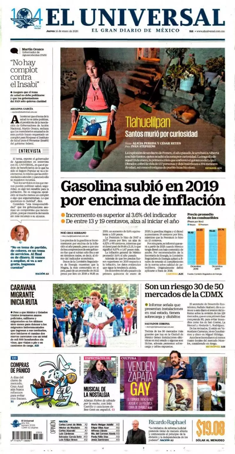 Los precios de las gasolinas Magna y Premium, así como diesel siguen al alza. En un mes —diciembre de 2019— y los primeros 15 días de este año, acumulan aumentos de 19 centavos por litro en el caso de la Magna, 13 centavos en la Premium, y 19 centavos por litro en el diesel, reporta El Universal. De acuerdo con información de la Comisión Reguladora de Energía (CRE), los movimientos al alza son constantes. En 2019, los usuarios pagaron 19.35 pesos —promedio anual nacional— por cada litro de Magna, mientras que en 2018 su precio promedio anual fue de 18.32 pesos.