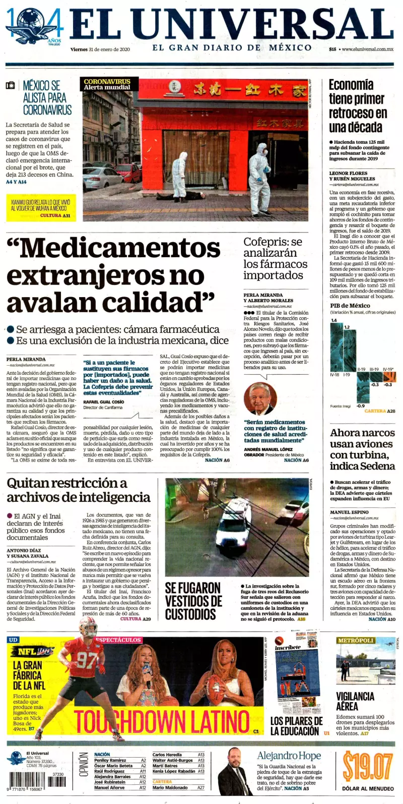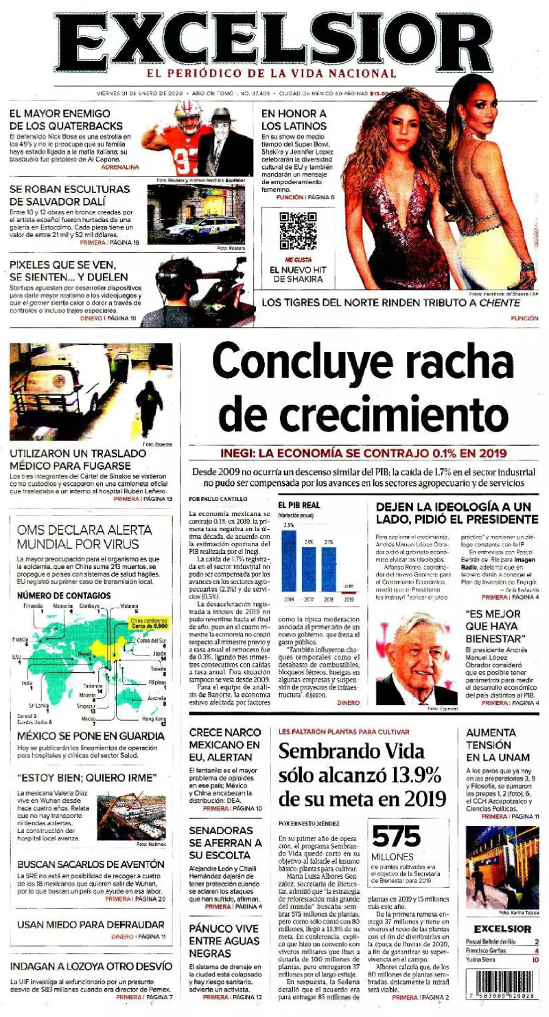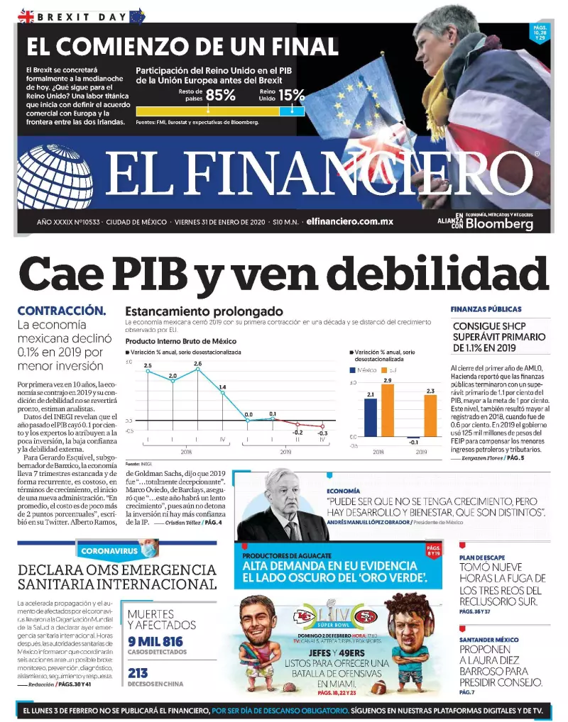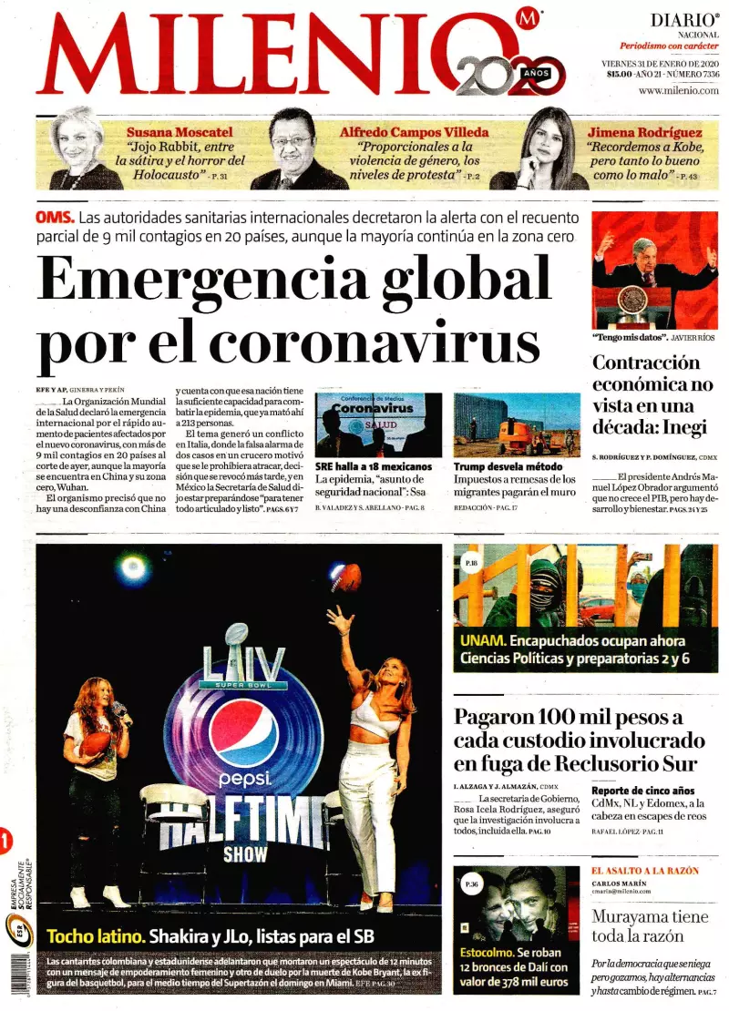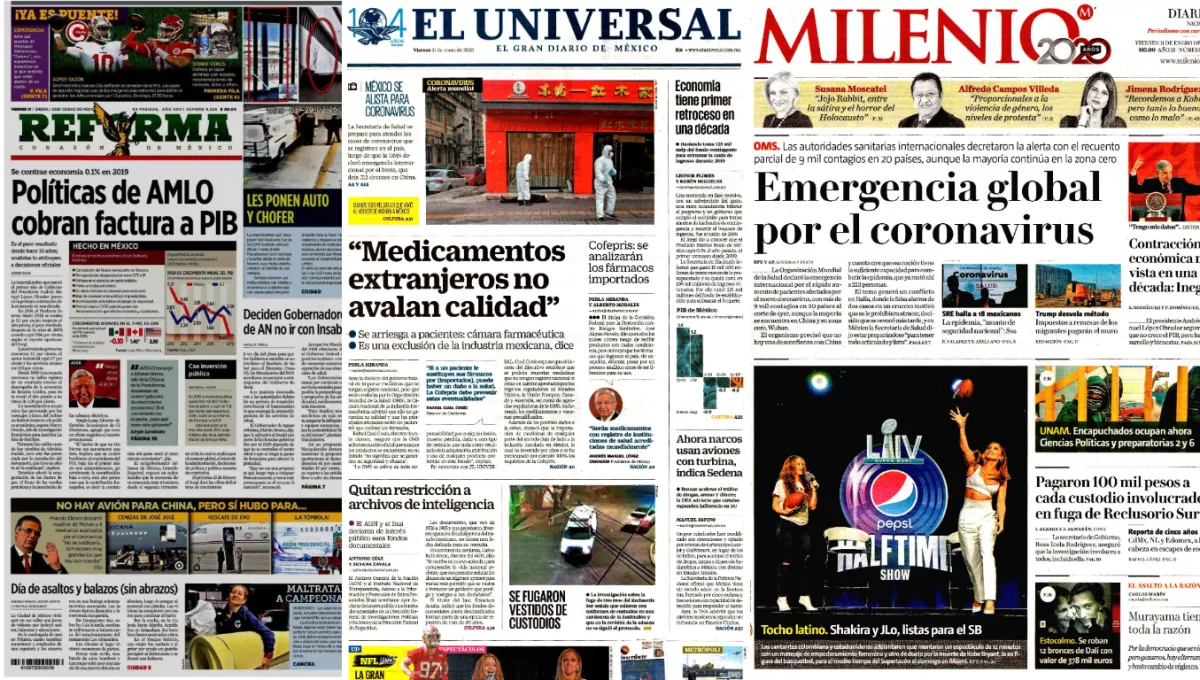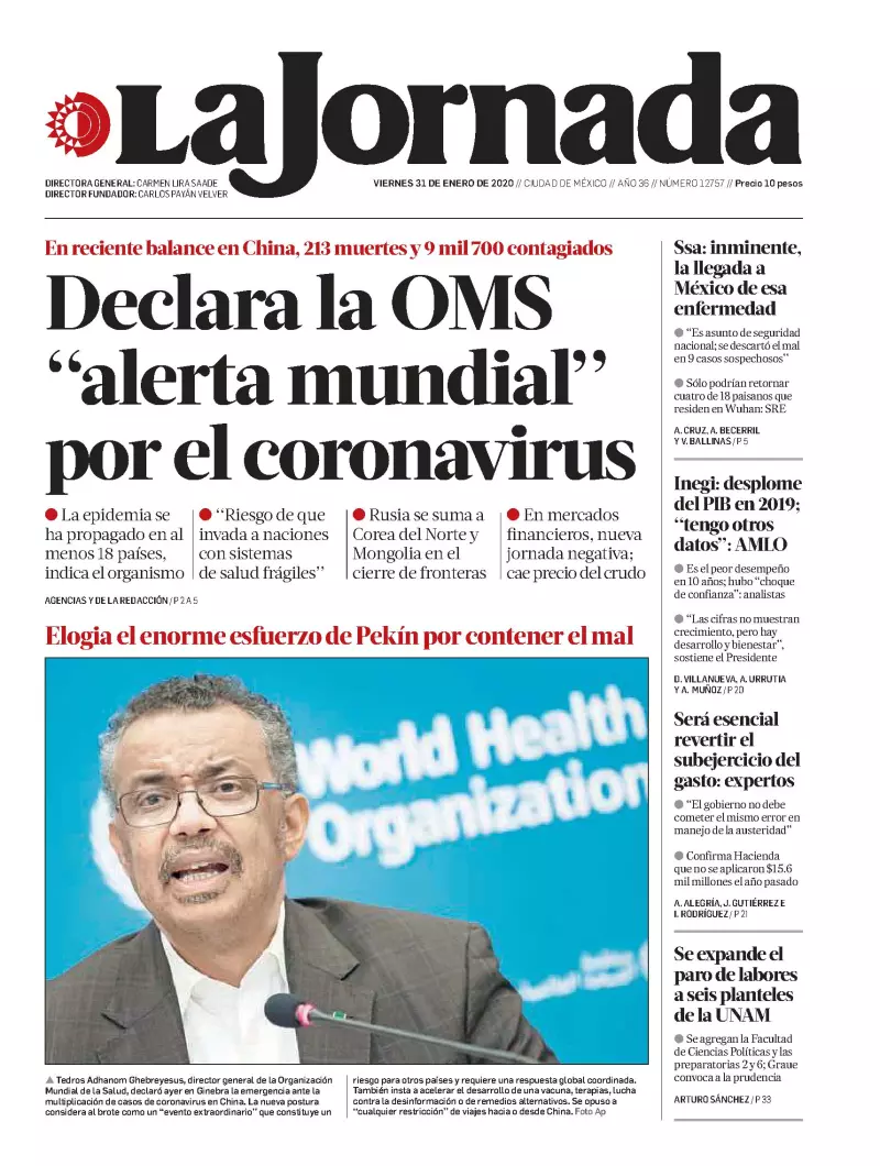Las primeras planas también consignan cómo la Organización Mundial de la Salud (OMS) declaró ayer emergencia internacional ante el brote del nuevo coronavirus 2019-nCov que ya provocó la muerte de 213 personas, unas 9 mil 700 contagiadas y más de cien mil bajo observación médica, tan solo en China, además de que se ha propagado en al menos 18 muertos.