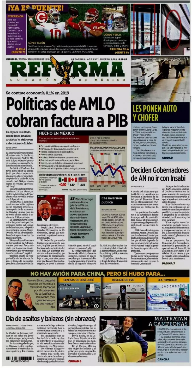 La incertidumbre que marcó el primer año de gobierno del presidente Andrés Manuel López Obrador provocó la primera contracción de la economía en una década, señala Reforma en unos de los temas que destacan los diarios en sus portadas.