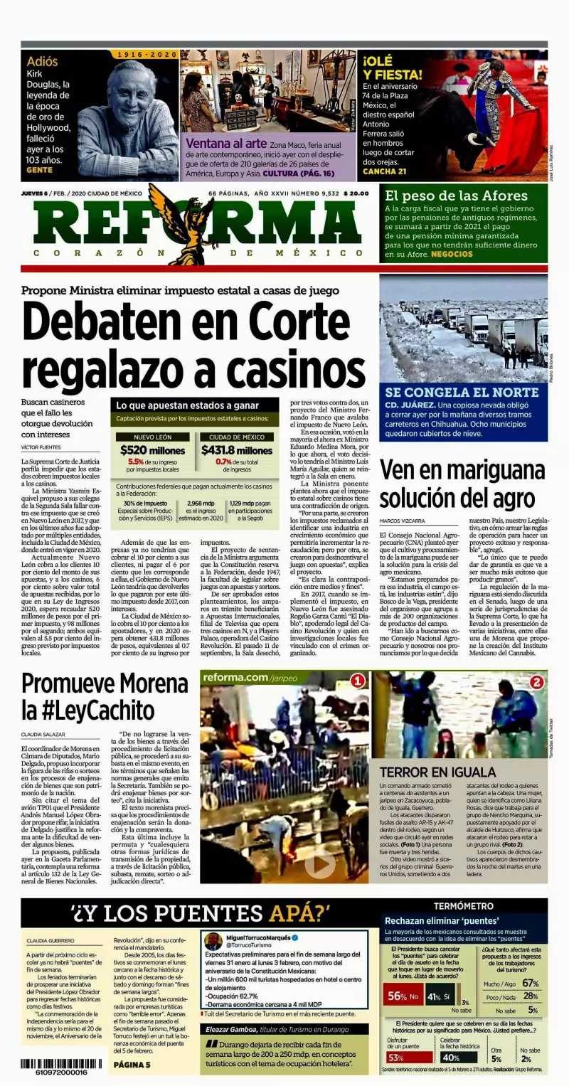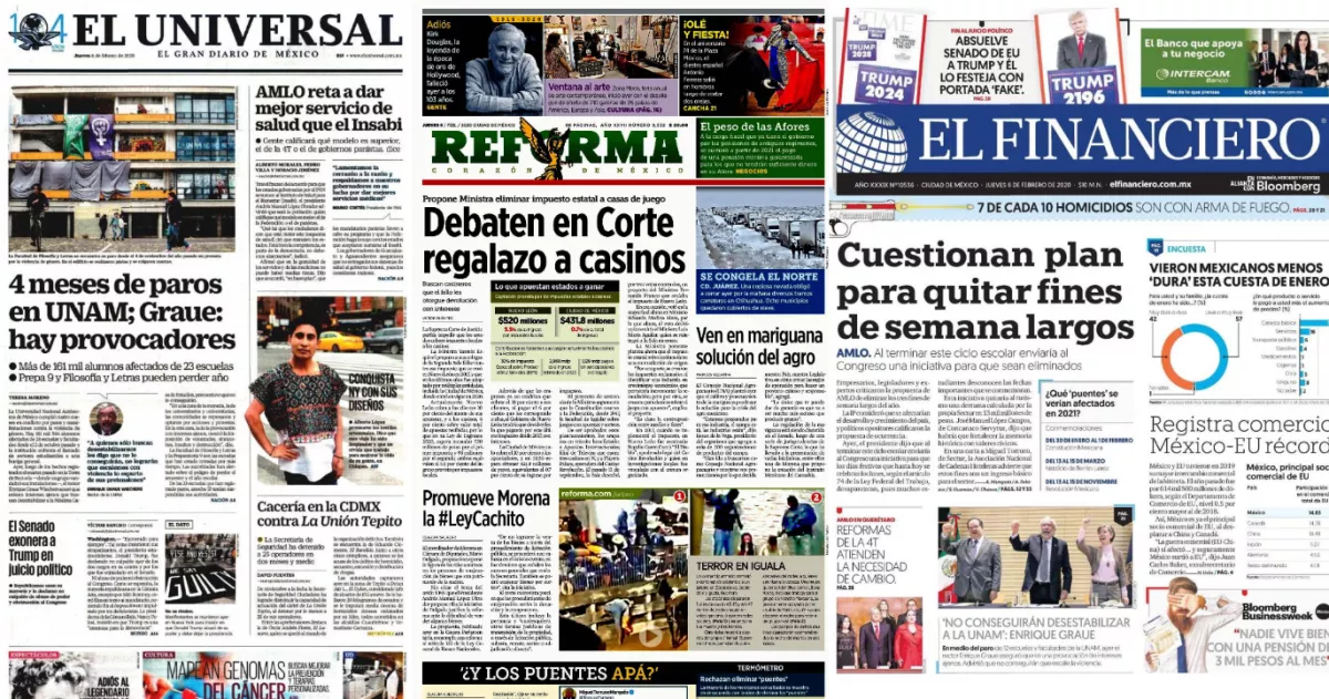 En tanto, Reforma consigna cómo la Suprema Corte perfila impedir que los estados cobren impuestos locales a los casinos, y El Financiero da cuenta de que líderes partidistas, legisladores de oposición y hoteleros ven en la desaparición de los fine de semana largos un ‘error' y 'una ocurrencia’.