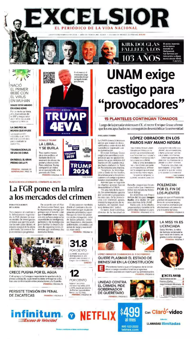 La UNAM cumplió cuatro meses en conflicto por paros y manifestaciones en contra de la violencia de género. En la Facultad de Filosofía y Letras, así como en la Escuela Nacional Preparatoria 9 Pedro de Alba, las autoridades alertaron sobre el peligro de perder el semestre y el año escolar ante la prolongación de la suspensión de clases, reseña El Universal en uno de los temas que figura en las portadas de distintos diarios.