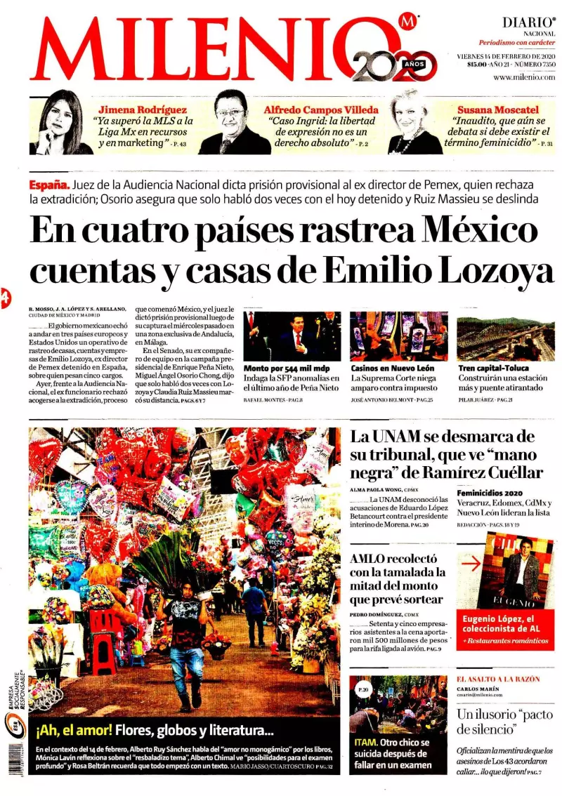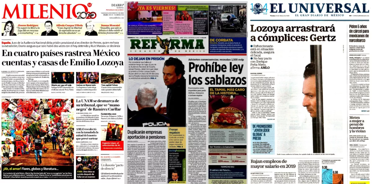 El gobierno federal rastrea cuentas, empresas y bienes de Emilio Lozoya Austin, ex director de Petróleos Mexicanos (Pemex), en Suiza, España, Alemania y Estados Unidos a fin de tener claro a cuánto ascienden y establecer la estrategia para solicitar su repatriación, consigna Milenio en uno de los temas de portada.