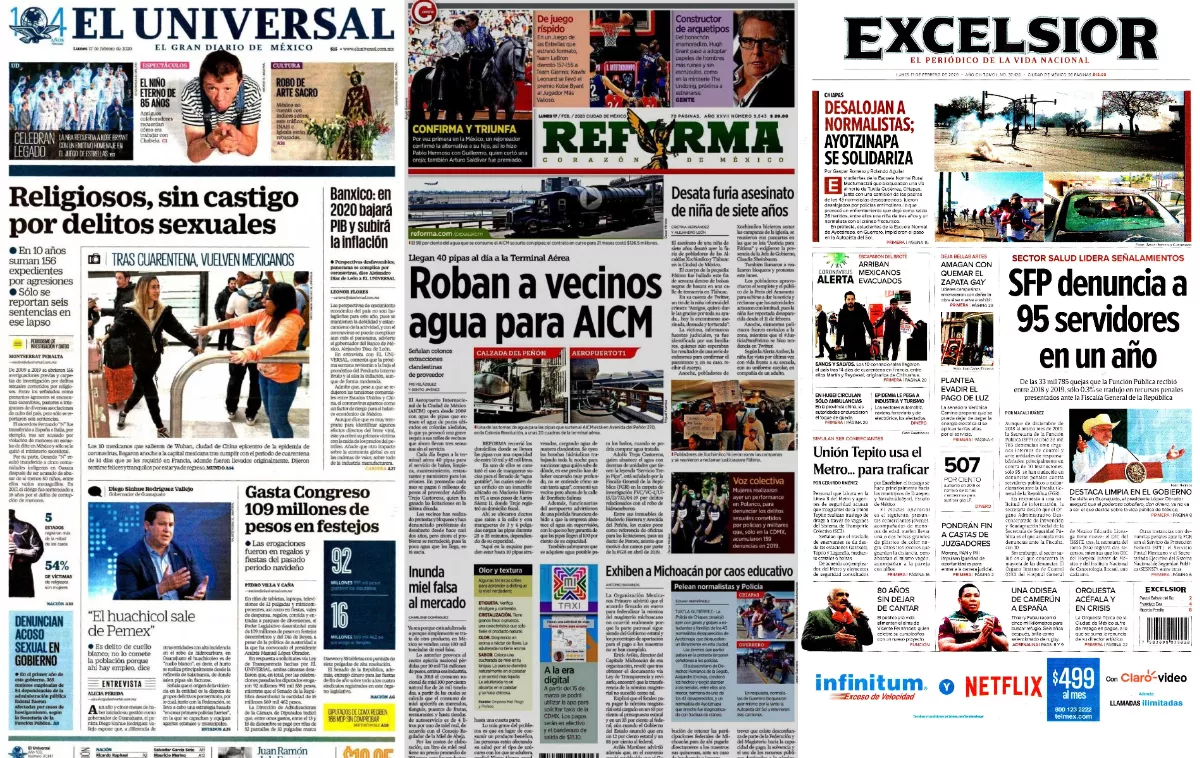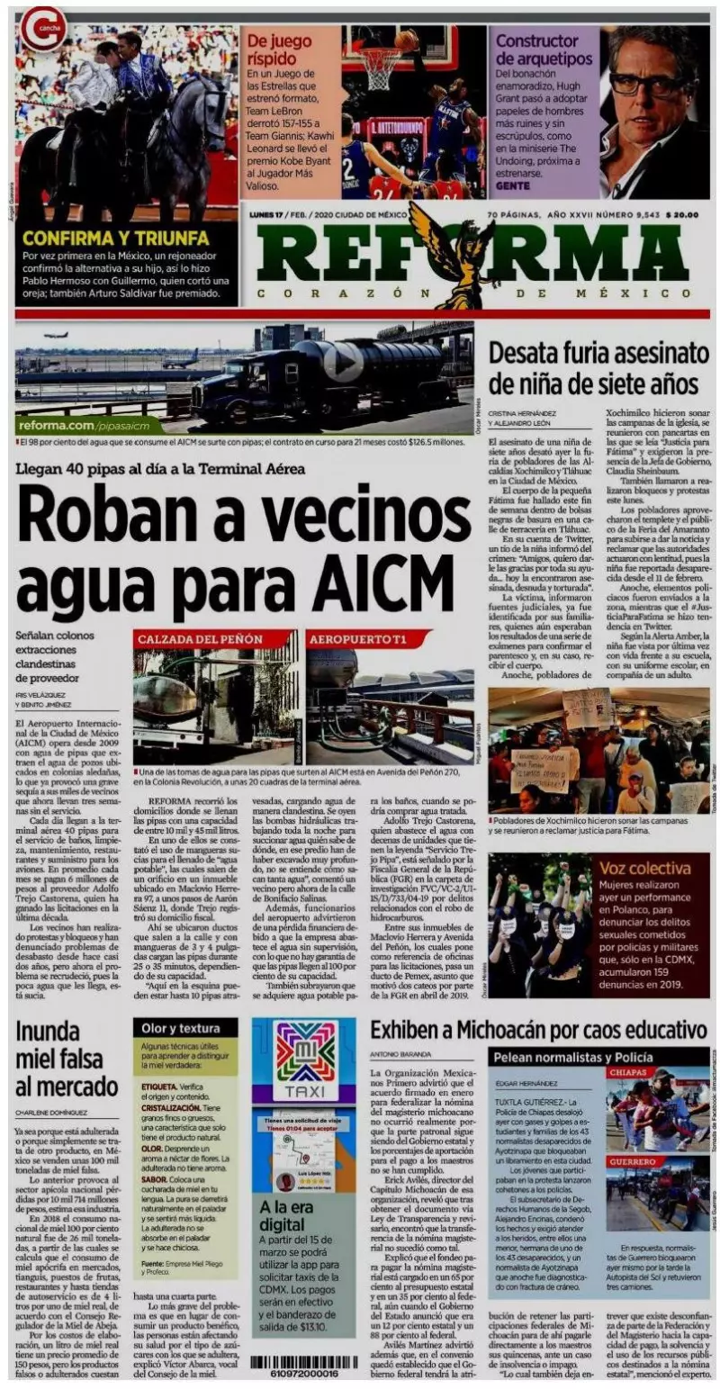 El Aeropuerto Internacional de la Ciudad de México (AICM) opera desde 2009 con agua de pipas que extraen el agua de pozos ubicados en colonias aledañas, lo que ya provocó una grave sequía a sus miles de vecinos que ahora llevan tres semanas sin el servicio, publica Reforma. Cada día llegan a la terminal aérea 40 pipas para el servicio de baños, limpieza, mantenimiento, restaurantes y suministro para los aviones. En promedio cada mes se pagan 6 millones de pesos al proveedor Adolfo Trejo Castorena, quien ha ganado las licitaciones en la última década.
