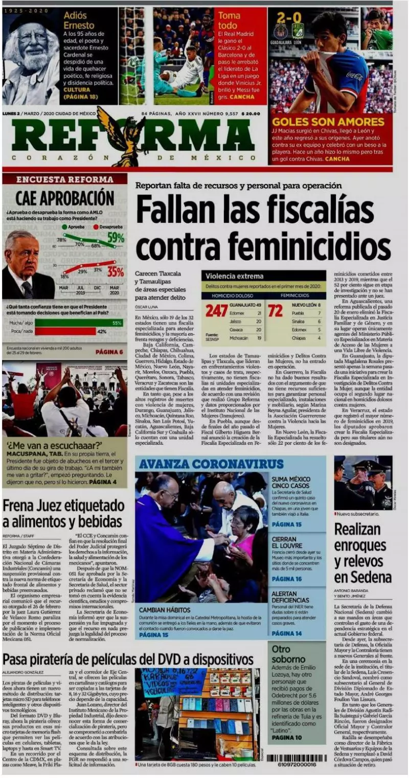 Solo 19 estados tienen una fiscalía especializada para atender feminicidios, y la mayoría enfrenta rezagos y deficiencias, reporta Reforma. En tanto que, pese a los altos registros de muertes con violencia de mujeres, Durango, Guanajuato, Jalisco, Michoacán, Quintana Roo, Sinaloa, San Luis Potosí, Yucatán, Aguascalientes, Baja California Sur y Coahuila sólo cuentan con una unidad especializada.