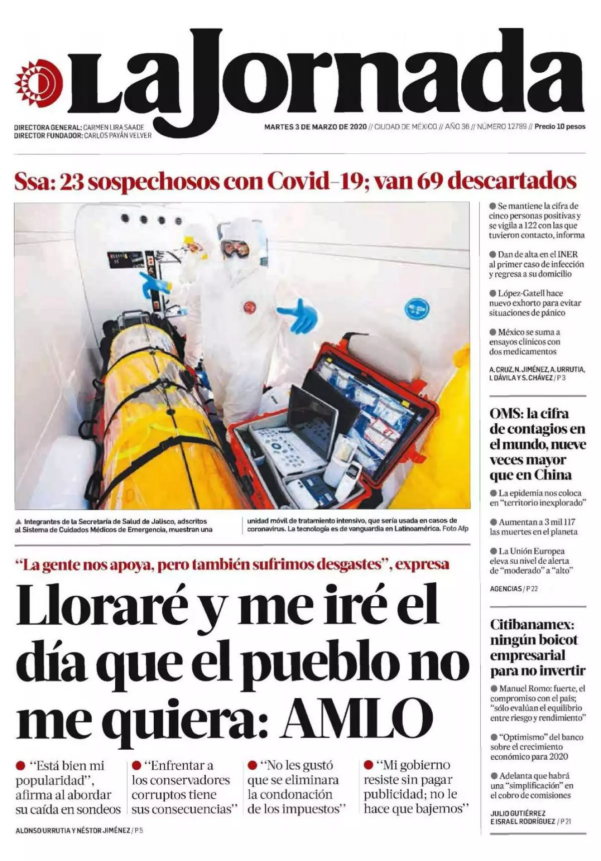 "El día que el pueblo no me quiera, ese día voy a llorar y me voy a Palenque, así de claro", afirmó el presidente Andrés Manuel López Obrador al hablar sobre la caída en las preferencias que ha tenido su gobierno, reseña La Jornada. "Acerca de mi popularidad, estamos bien, tenemos mayoría, la gente nos está apoyando. También sufrimos desgastes. ¡Imagínense, enfrentar a los conservadores corruptos que no quieren dejar de robar! Están molestísimos, no los calienta ni el sol. Están desquiciados".