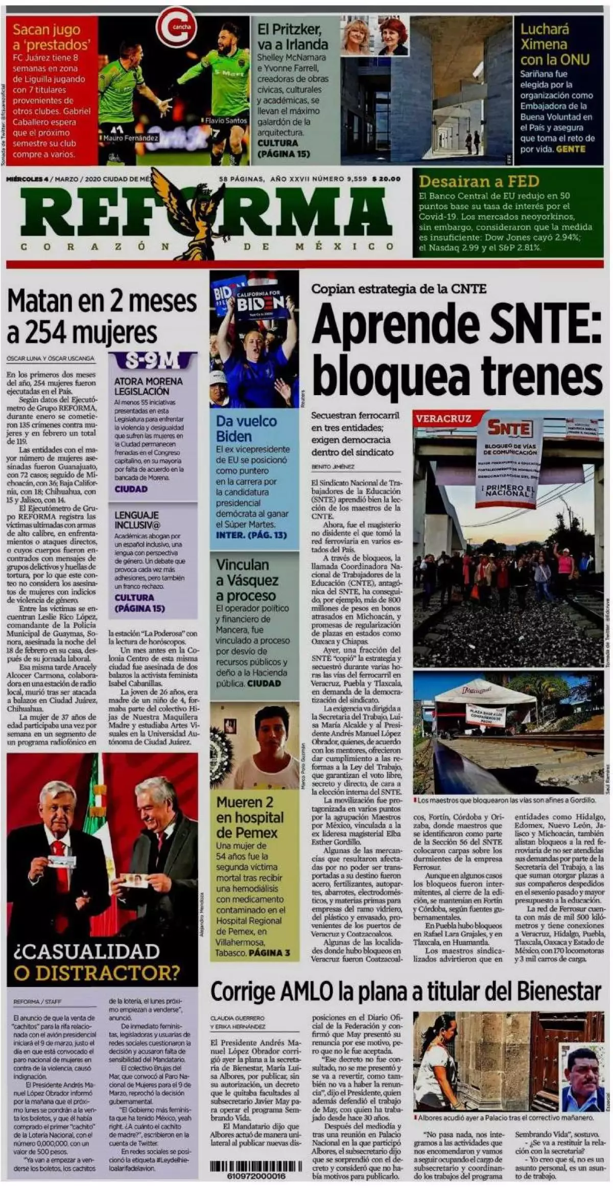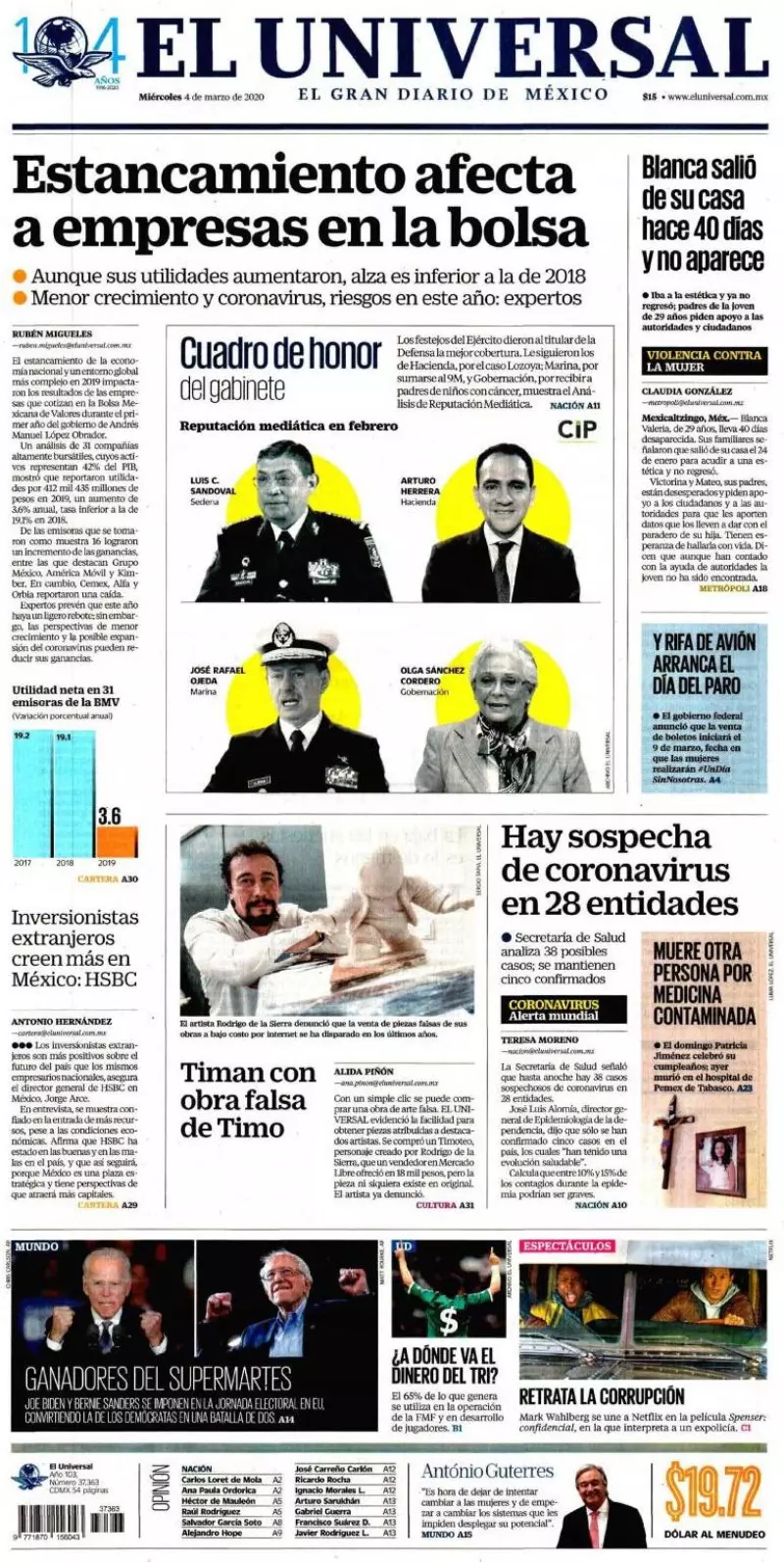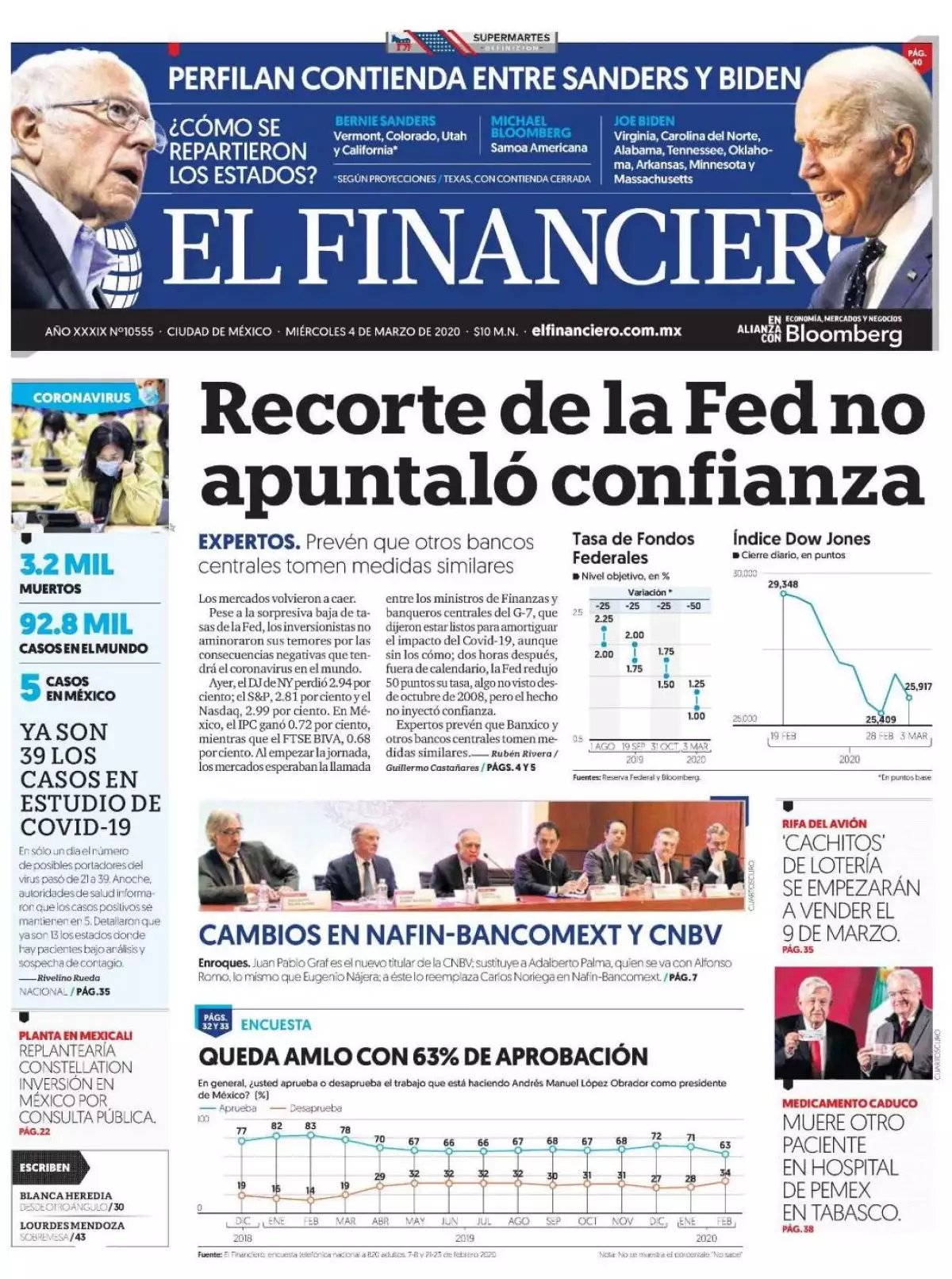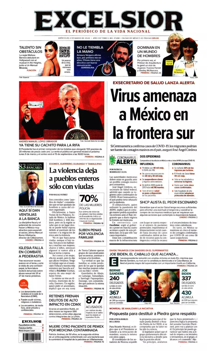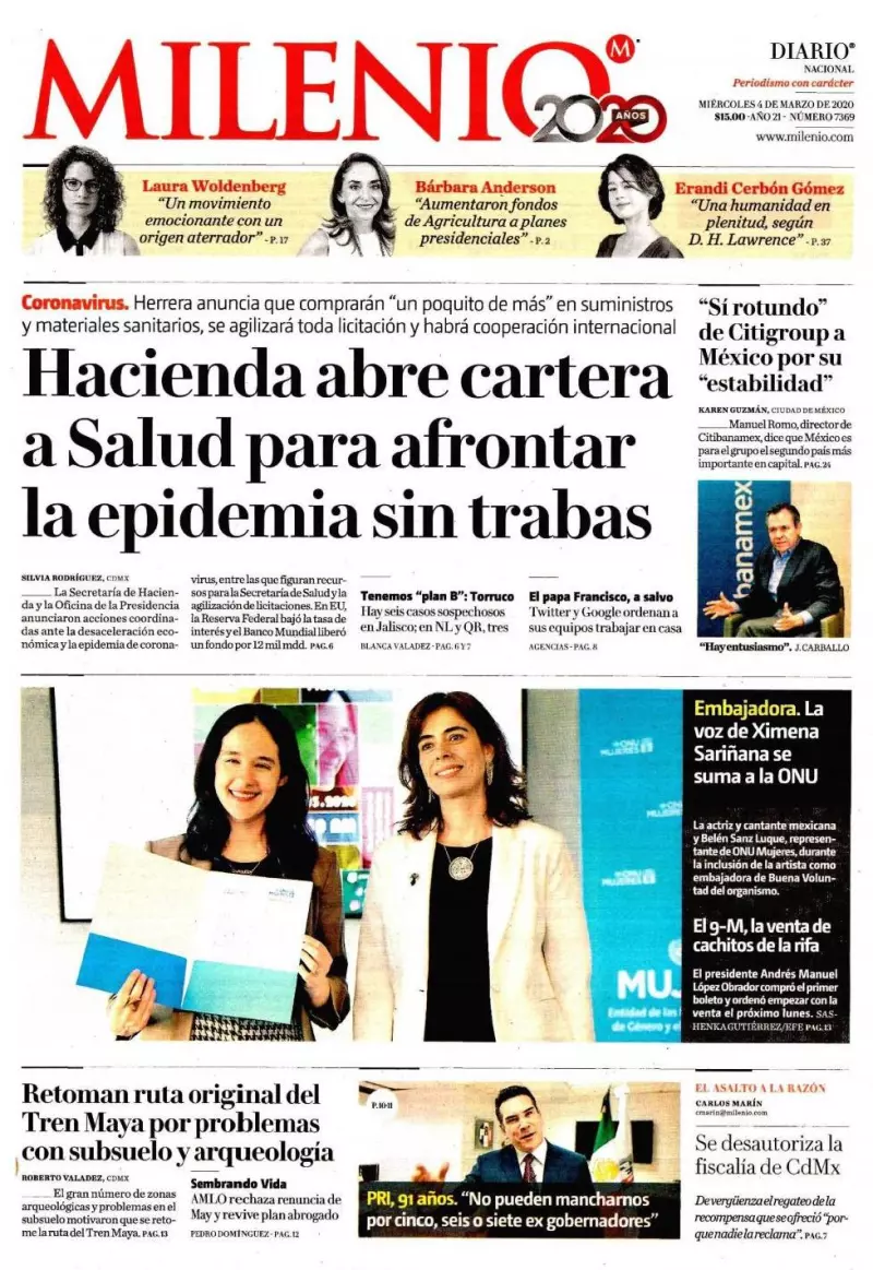 La Secretaría de Hacienda y la Oficina de la Presidencia anunciaron acciones coordinadas ante la desaceleración económica y la epidemia de coronavirus, entre las que figuran recursos para la Secretaría de Salud y para impulsar el crecimiento económico, así como la agilización de licitaciones para la inversión, refieren los medios en uno de los temas de portada.