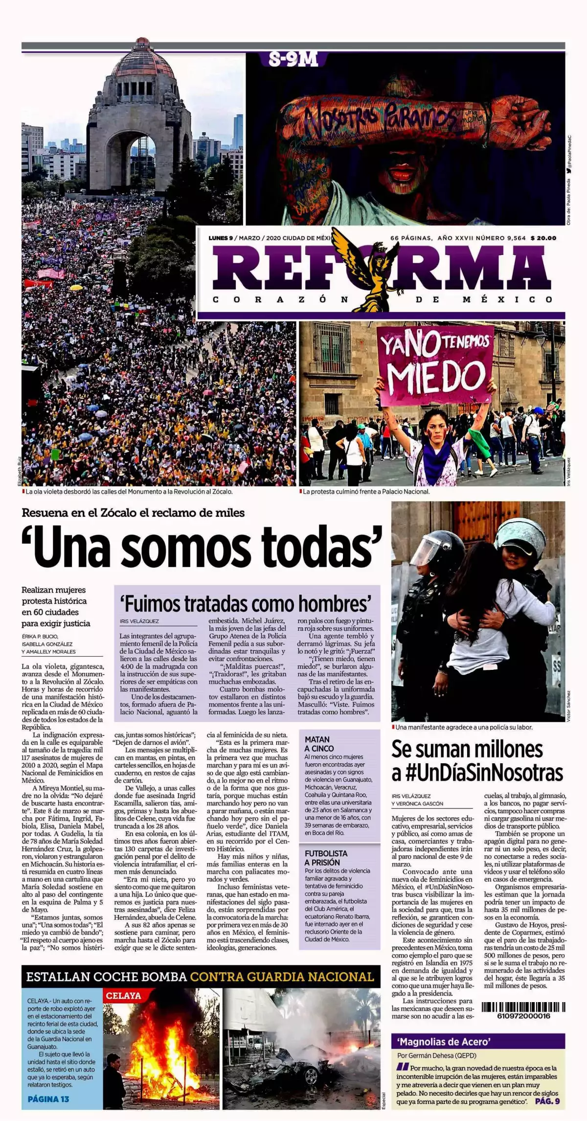 Indignadas por la agonía de Fátima y los oídos sordos de un Poder Judicial que abandonó a Ingrid, a Abril y a tantas más que murieron o sufrieron abusos por el hecho de ser mujeres, miles de voces se alzaron ayer, en todo el país, en protesta contra la violencia de género, señala Excélsior . En la Ciudad de México, en el Día Internacional de la Mujer, 80 mil estudiantes, profesionistas, indígenas, trabajadoras domésticas, científicas... marcharon del Monumento a la Revolución al Zócalo, gritando consignas como “¡Hay que abortar al sistema patriarcal!”.