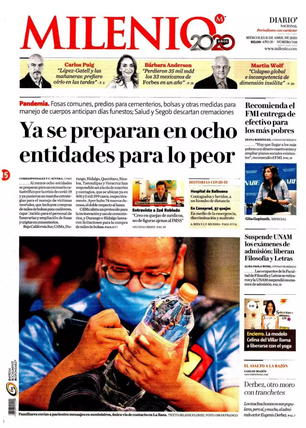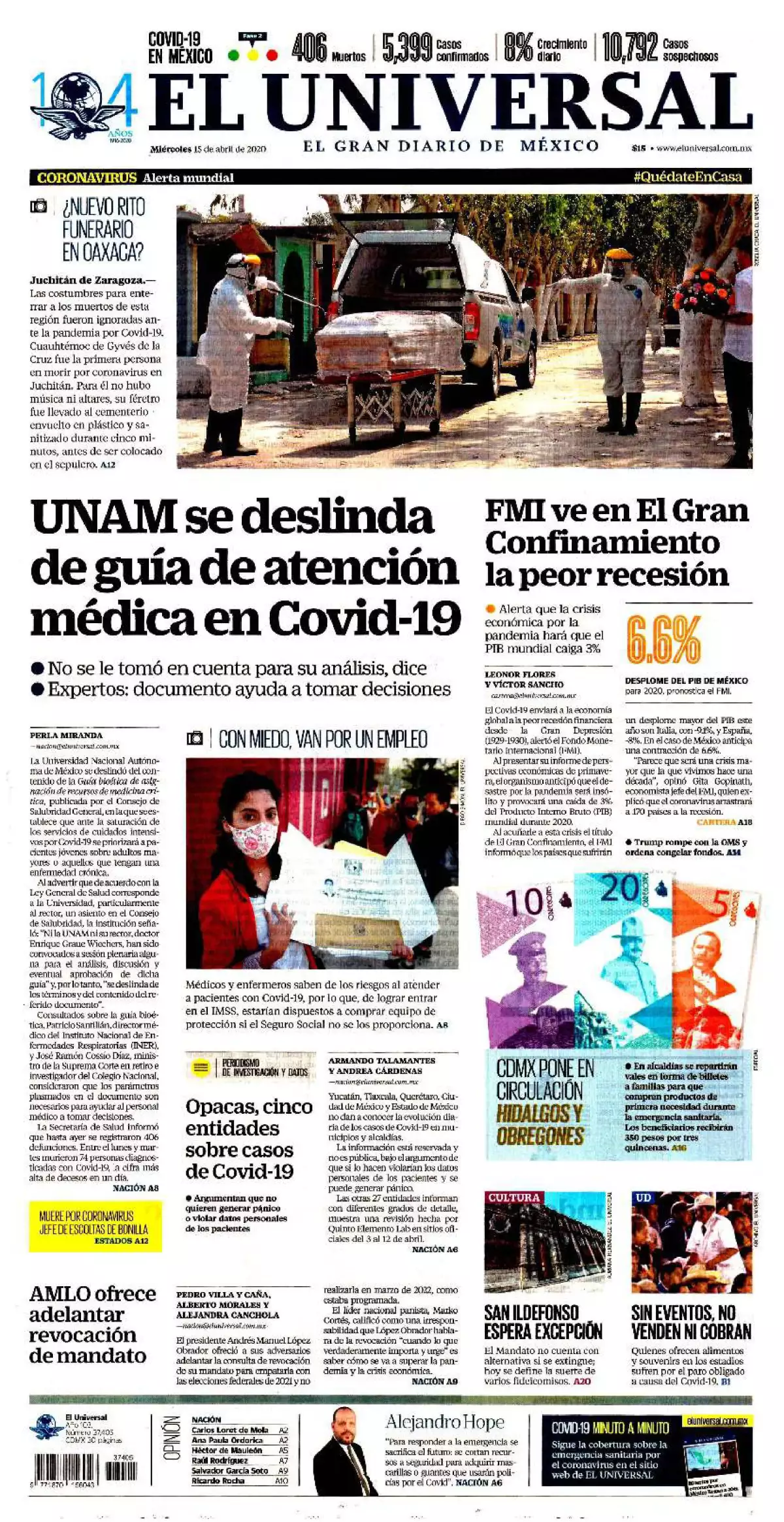 La Universidad Nacional Autónoma de México (UNAM) se deslindó del contenido de la Guía Bioética de Asignación de Recursos de Medicina Crítica publicada por el Consejo de Salubridad General, en la que se establece que ante la saturación de los servicios de cuidados intensivos por el COVID-19, se priorizará a pacientes jóvenes sobre adultos mayores, o de aquellos que tengan una enfermedad crónica, destaca El Universal en uno de los temas de portada.