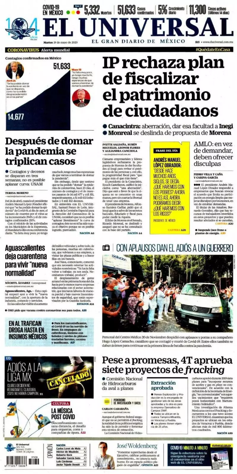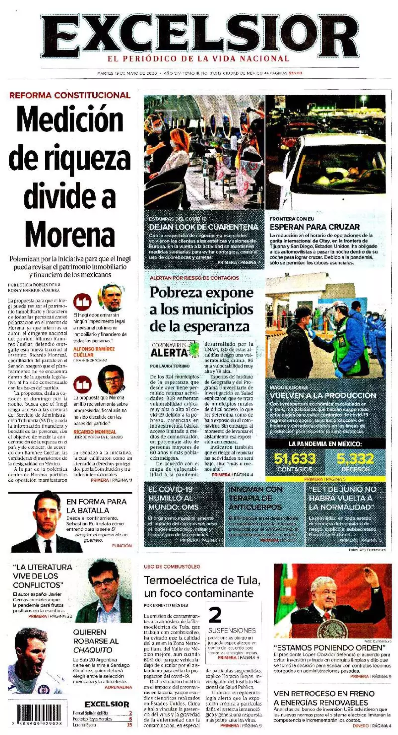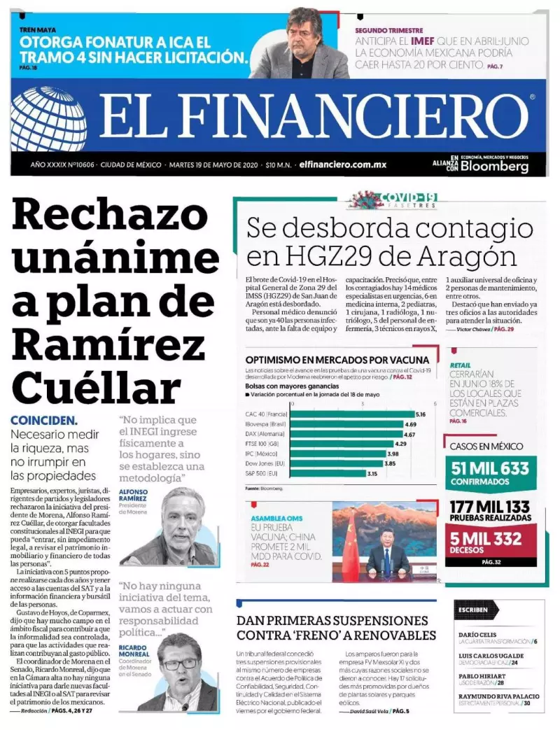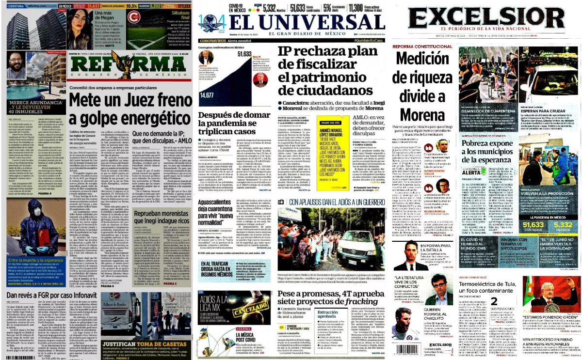 En tanto, El Universal consigna que la propuesta de Morena para dar facultades al Inegi a fin de revisar el patrimonio inmobiliario y financiero de todas las personas generó el rechazo de cámaras empresariales y analistas, que consideran inviable el plan porque contraviene la confidencialidad de datos de la población.