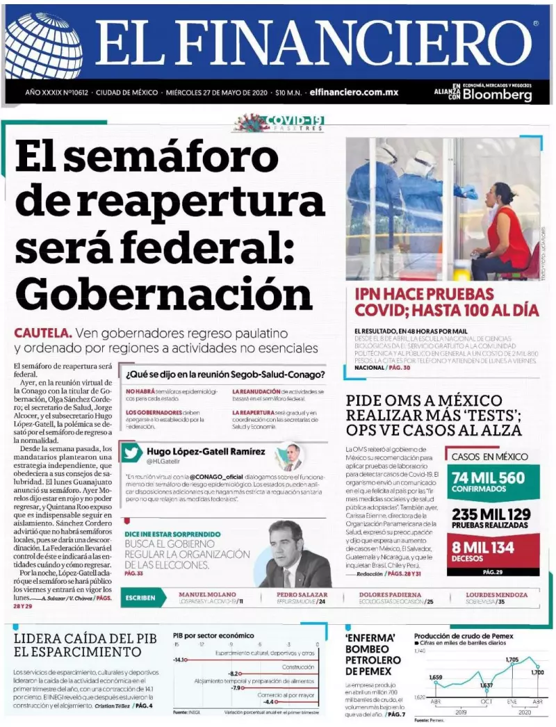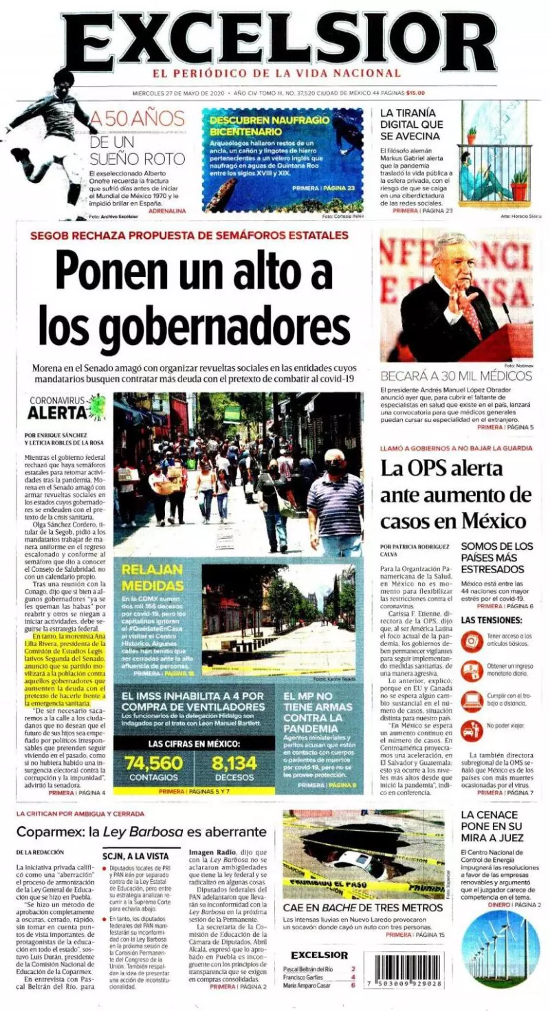 De cara al regreso a la nueva normalidad, después del confinamiento por la epidemia, el gobierno del presidente Andrés Manuel López Obrador quiere llevar el control de un semáforo general que le indique a las entidades federativas cuándo y cómo regresar a sus actividades, contrario a lo que han manifestado gobernadores, señala El Financiero. La secretaria de Gobernación, Olga Sánchez Cordero, fue la encargada de responder a las intenciones de diversos mandatarios, quienes, desde la semana pasada, han planteado una estrategia propia, acorde con la ley y obedeciendo lo que dictaminen los consejos de salubridad en cada entidad, pero en una clara desobediencia al plan trazado desde Palacio Nacional.