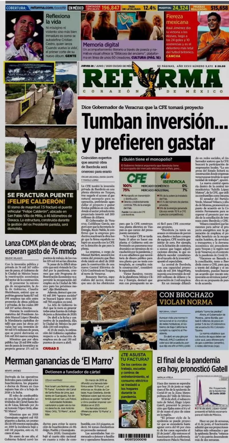 En tanto, Reforma señala que la CFE tumbó la inversión privada de Iberdrola en una planta eléctrica en Tuxpan, tras negarle el acceso al gas natural necesario para su operación, prefiriendo gastar fondos públicos en una obra donde el sector privado tenía proyectado invertir 1,200 millones de dólares.