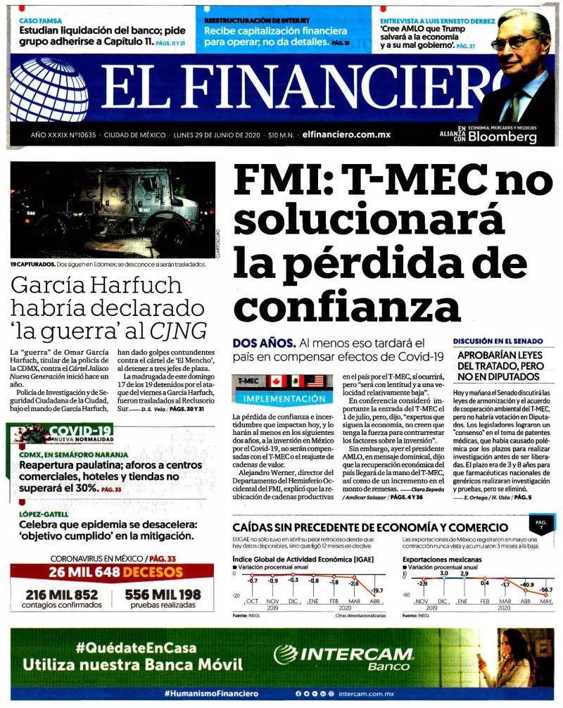 Ni la entrada en operación del T-MEC, ni el reajuste de las cadenas de valor que le podrán beneficiar al país, van a compensar en los próximos dos años la pérdida de confianza e incertidumbre en México, afirmó Alejandro Werner Wainfeld, director del Departamento del Hemisferio Occidental del Fondo Monetario Internacional (FMI), según reseña El Financiero . “Pensando en la recuperación, los expertos creen que los factores del T-MEC van a estar presentes, pero no van, digamos, a compensar totalmente las fuerzas negativas que están generando una contracción en la inversión de la economía mexicana”, alertó el exsubsecretario de Hacienda y Crédito Público.